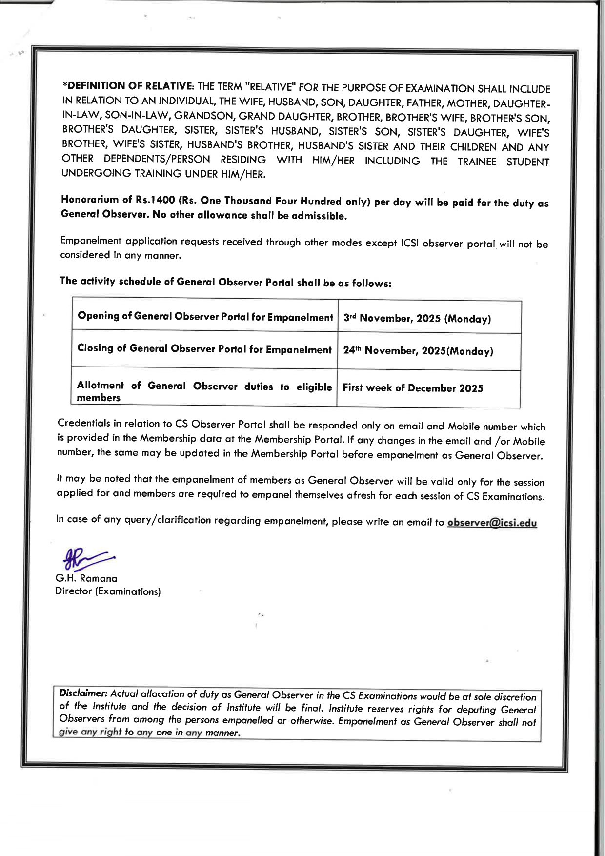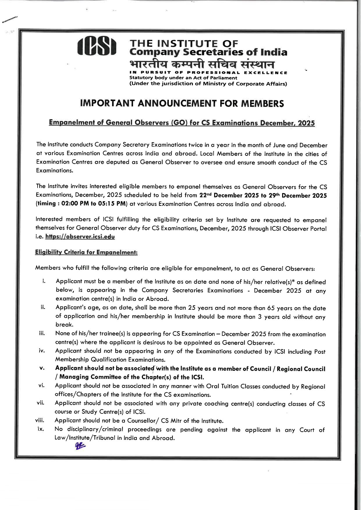 Empanelment of General Observers (GO) through Online Portal for CS Examinations, December, 2025