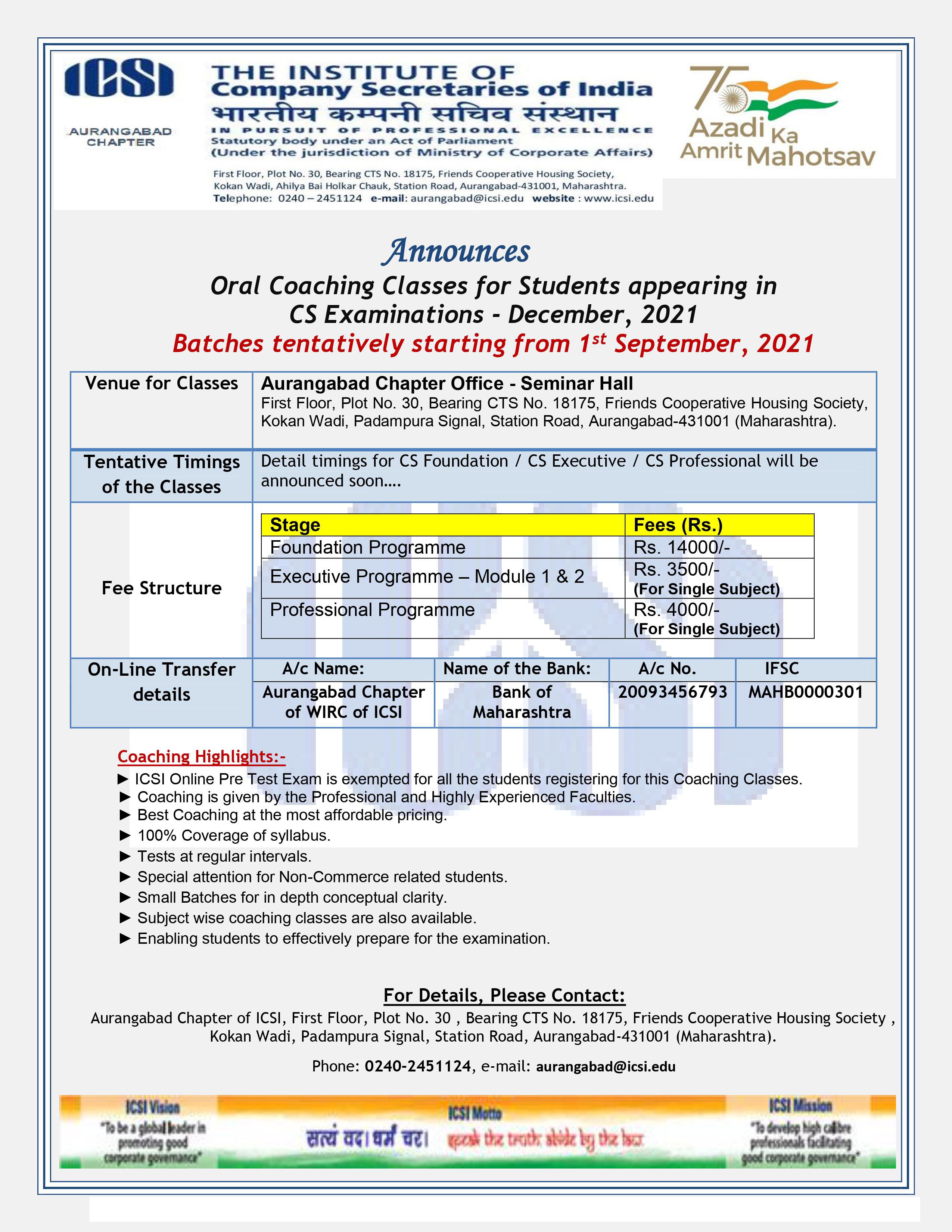 Oral Coaching Classes for CS Foundation, CS Executive and CS Professional Programme for CS December, 2021 Session Examination commences w.e.f. 01/09/2021