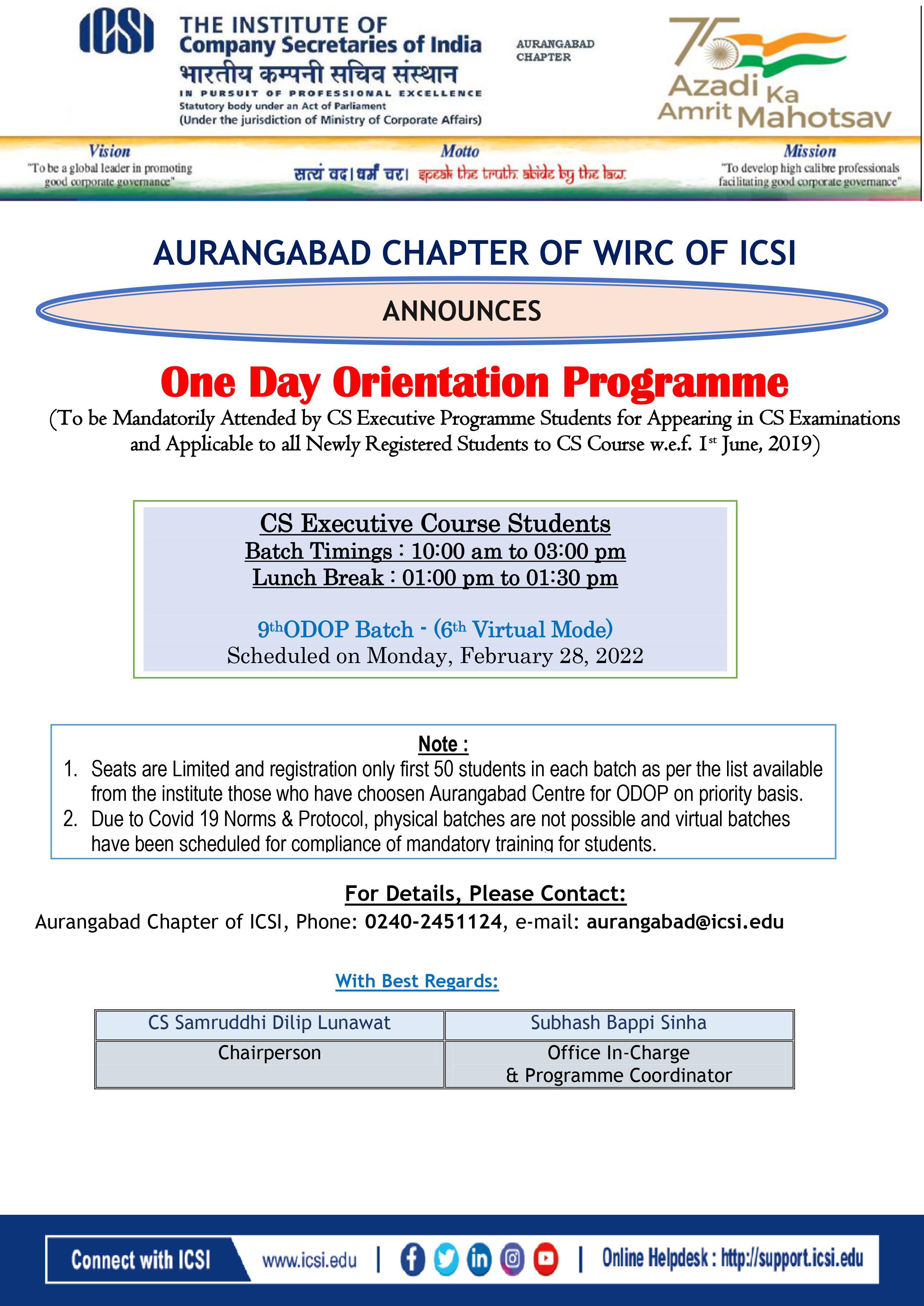 9th Batch - One Day Orientation Programme (ODOP) - (6th Virtual Mode) scheduled to be held on 28/02/2022 at 10:00 am