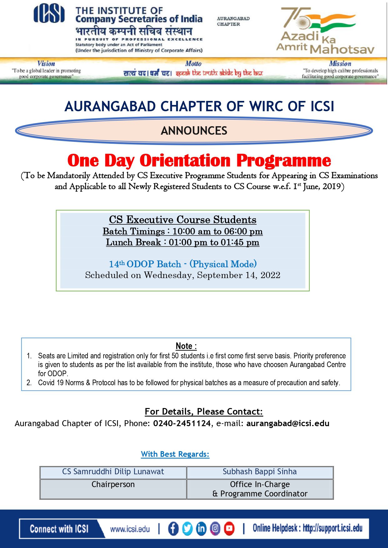 14th Batch - One Day Orientation Programme (ODOP) - (Physical Mode) scheduled to be held on 14/09/2022 at 10:00 am