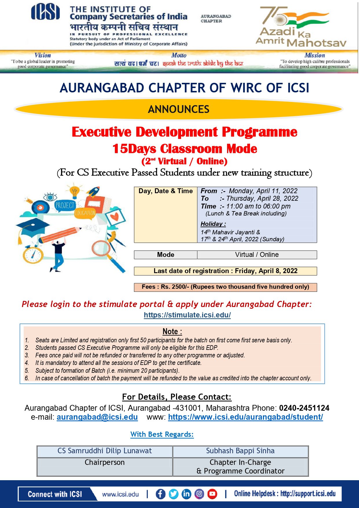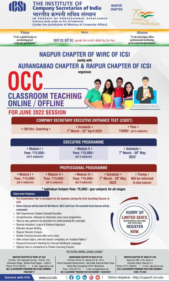 Aurangabad Chapter of WIRC of ICSI announces Oral Coaching Classes jointly with Nagpur and Raipur Chapter for CSEET, Executive and Professional Programme Students through Online mode for June 2022 session.