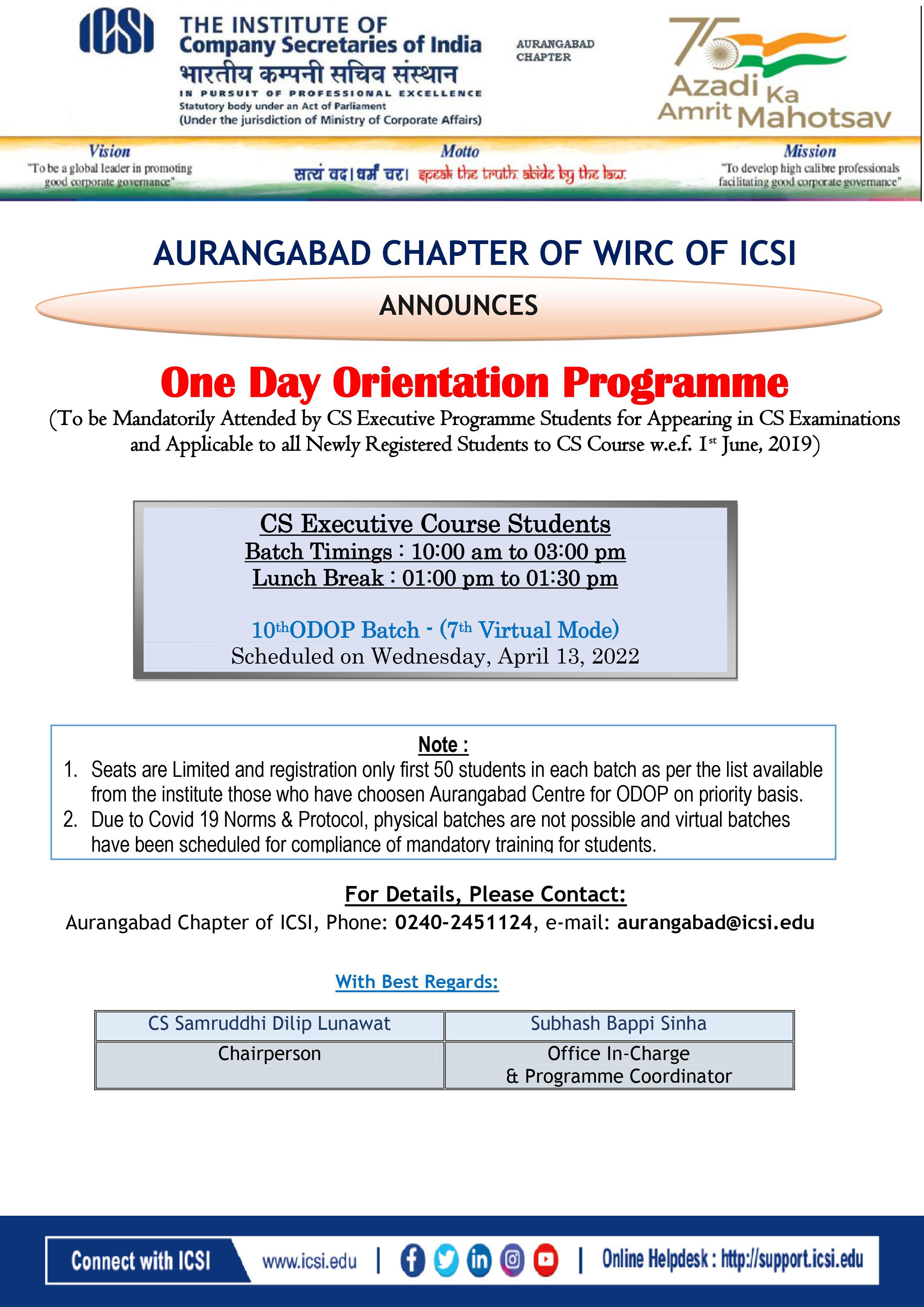 10th Batch - One Day Orientation Programme (ODOP) - (7th Virtual Mode) scheduled to be held on 13/04/2022 at 10:00 am