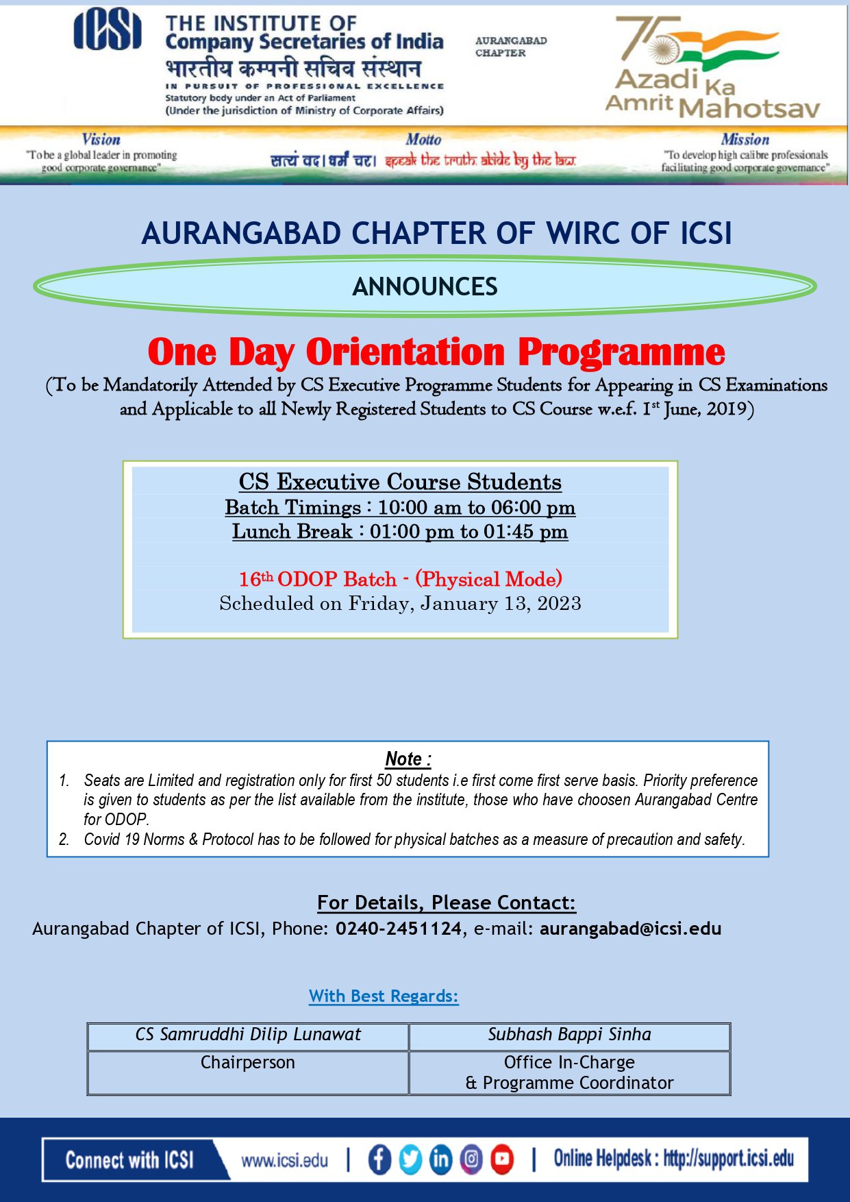 16th Batch - One Day Orientation Programme (ODOP) - (Physical Mode) scheduled to be held on 13/01/2023 at 10:00 am
