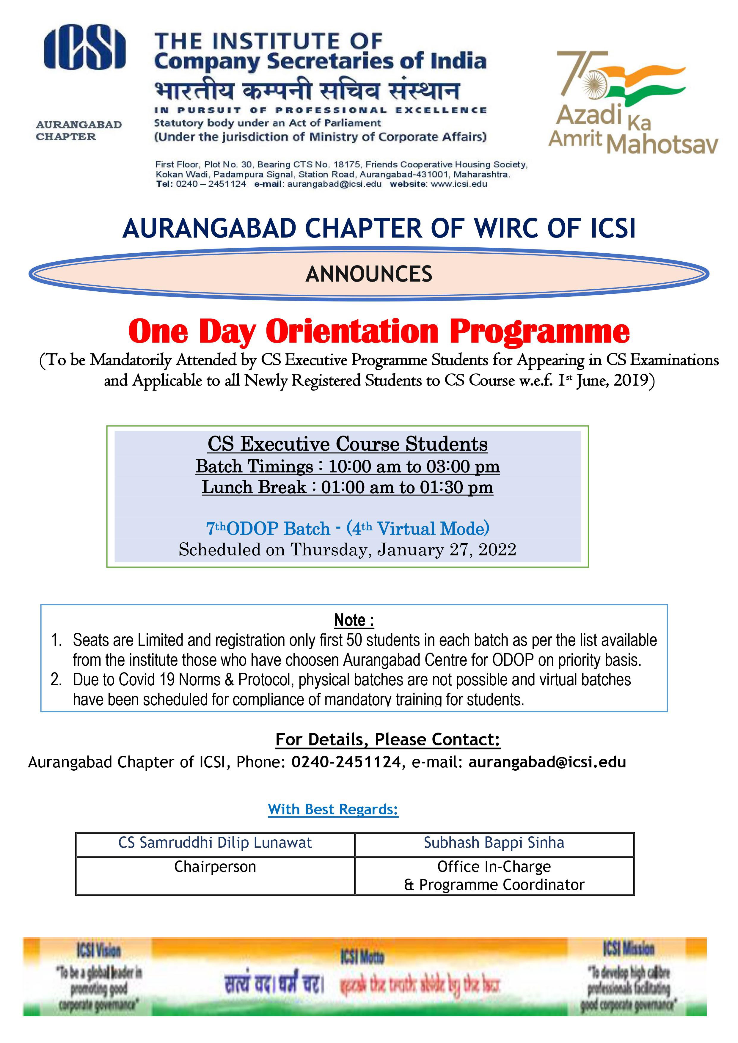 12th Batch - One Day Orientation Programme (ODOP) - (Physical Mode) scheduled to be held on 23/07/2022 at 10:00 am
