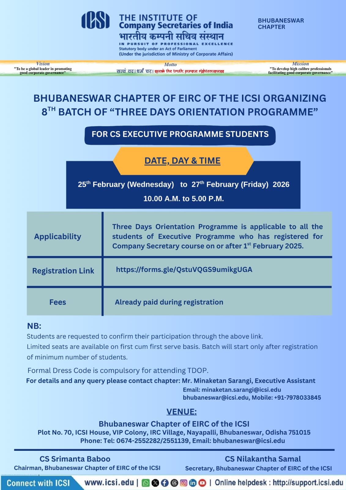 EXECUTIVE PROGRAMME CLASS ROOM TEACHING AT BHUBANESWAR CHAPTER FOR JUNE 2026 SESSION