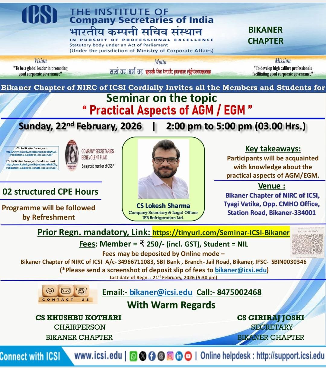 SEMINAR ON "PRACTICAL ASPECTS OF AGM / EGM" ON 22.02.206 AT BIKANER CHAPTER OF NIRC OF ICSI.