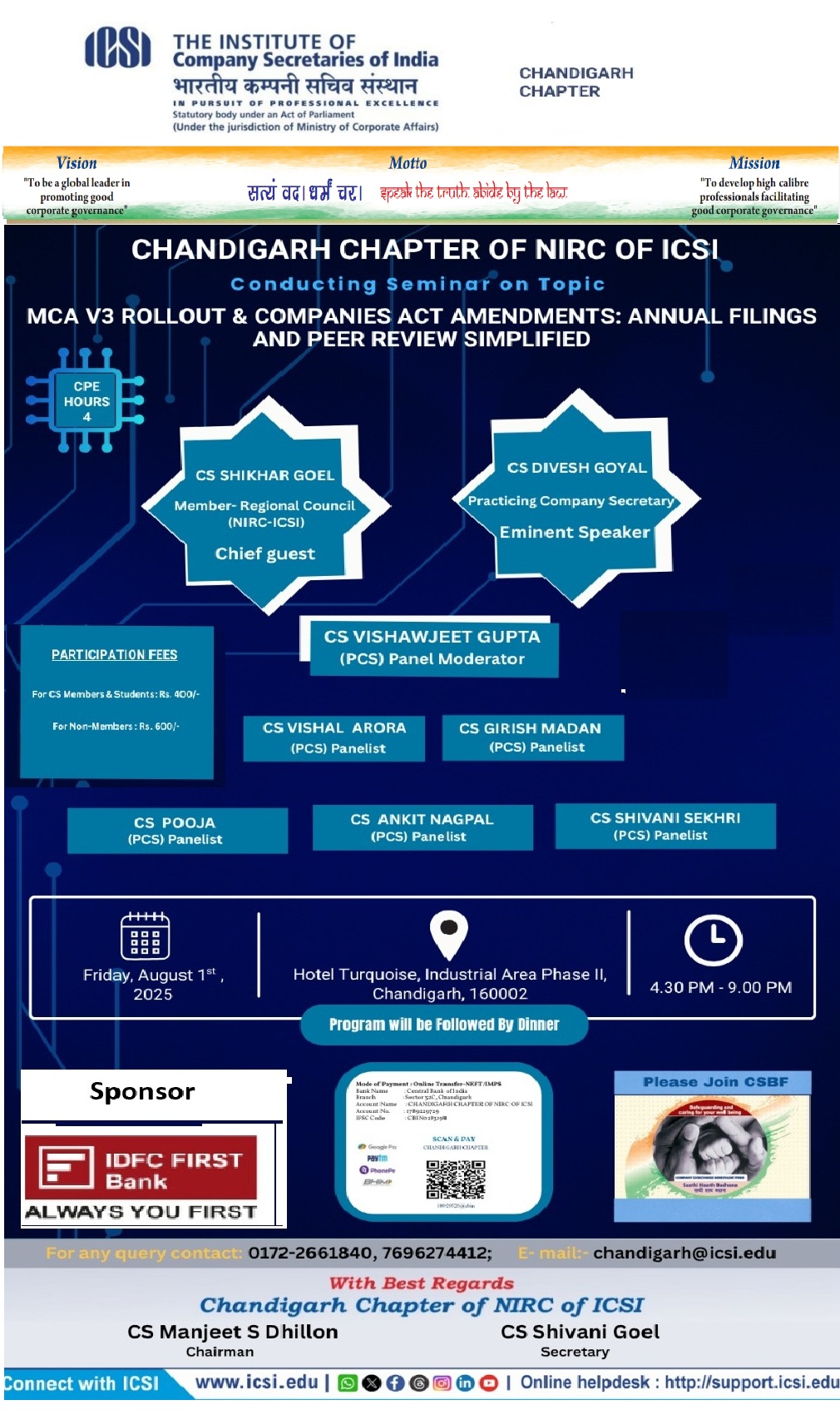 Seminar on MCA V3 Rollout & Companies Act Amendments | August 1, 2025 by Chandigarh Chapter