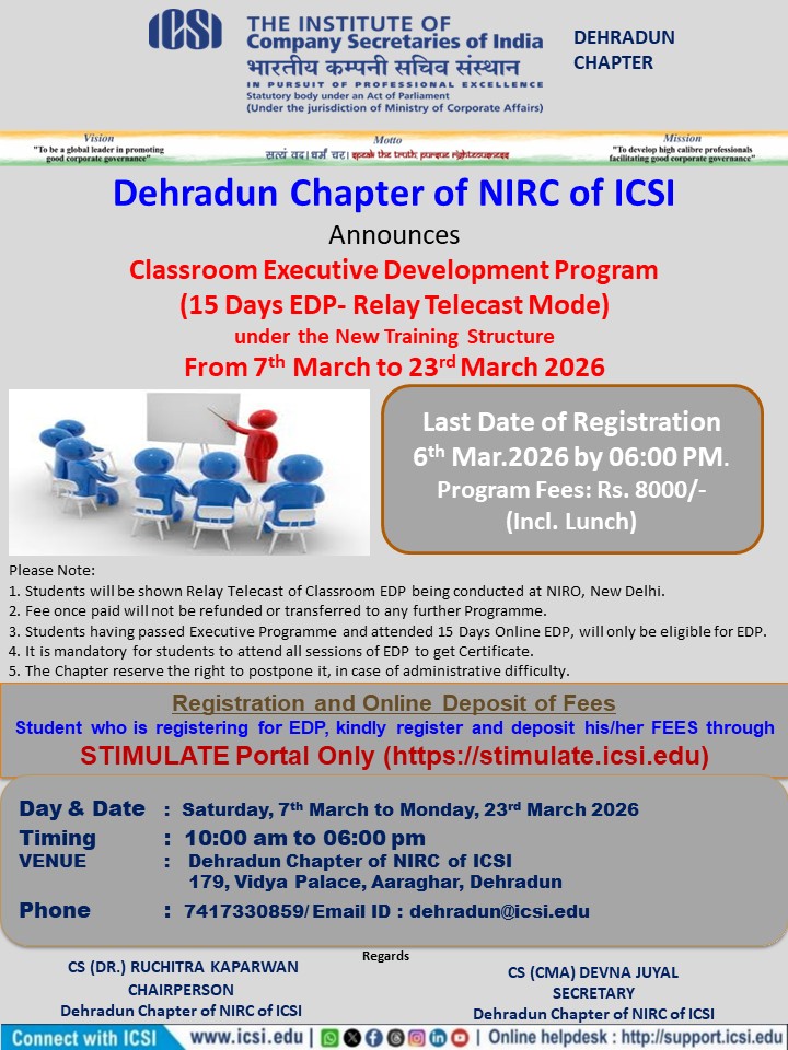 15 Days Executive Development Program (Relay Telecast Mode EDP) by Dehradun Chapter of NIRC of ICSI from Saturday 7th March, 2026 to Monday 23rd March, 2026