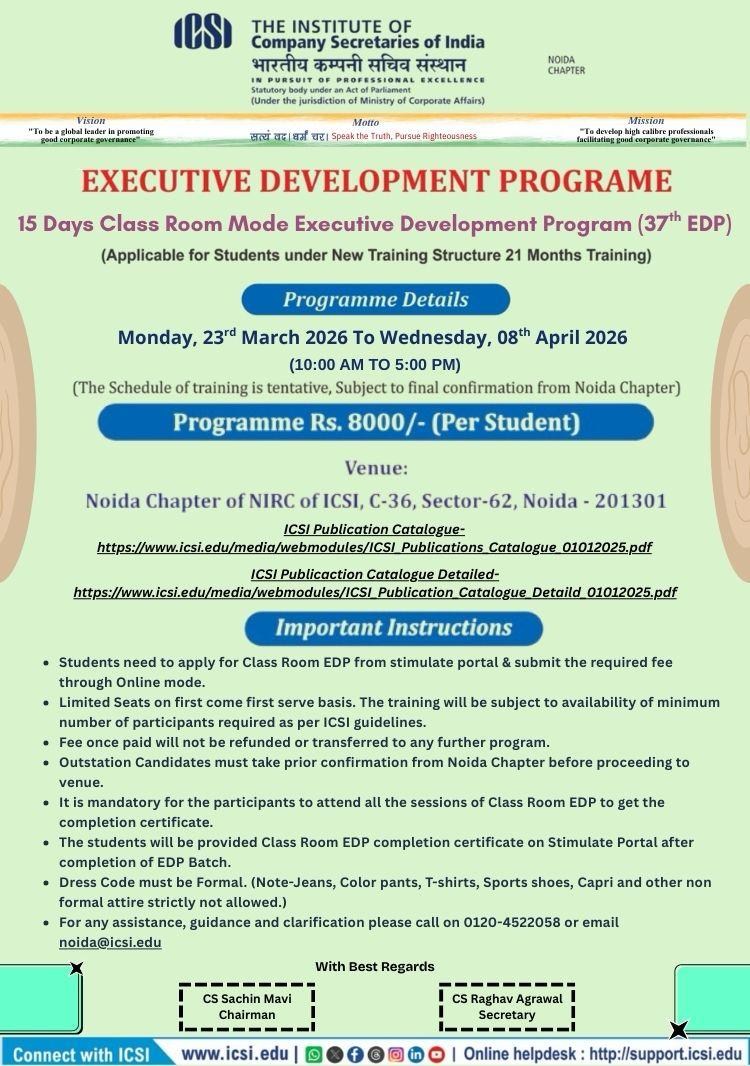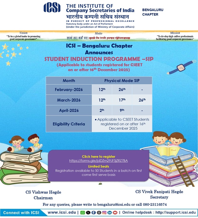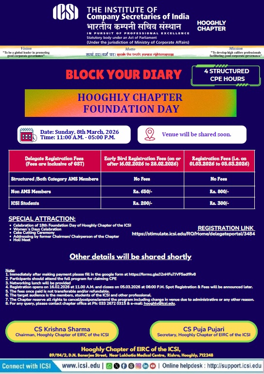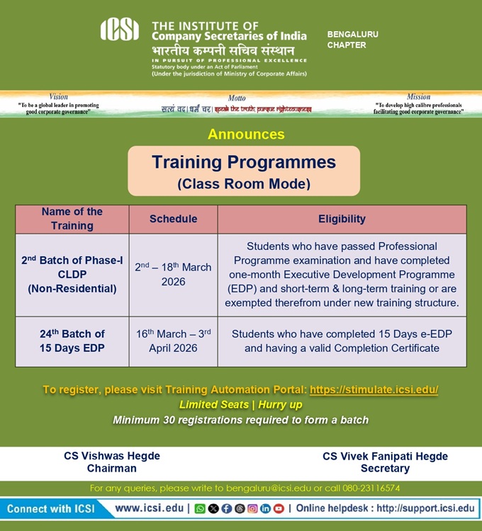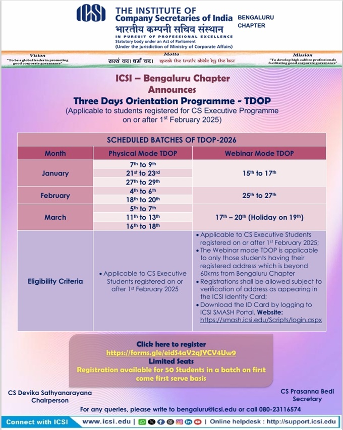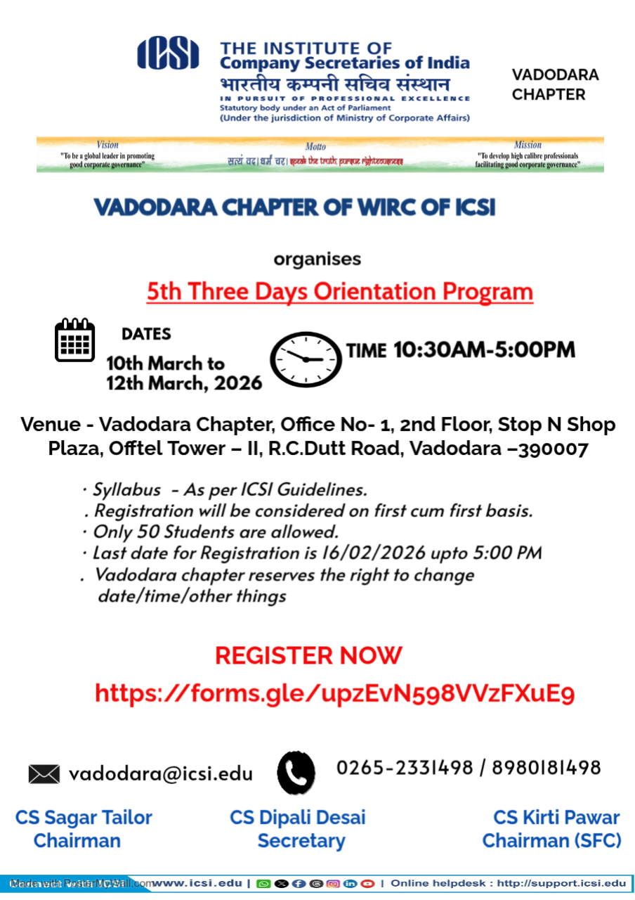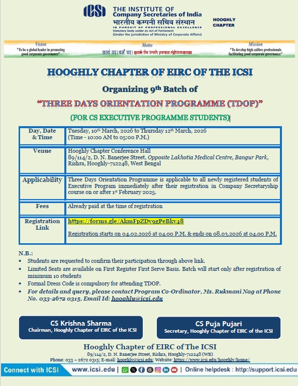 - Bhubaneswar Chapter Organizing - 08th Batch of Three Days Orientation Program (TDOP) will be held on 25th February to 27th February, 2026 at Chapter Office Premises. For any query please contact Chapter Office: 0674-2552282 / 2551139, mail to: bhubaneswar@icsi.edu