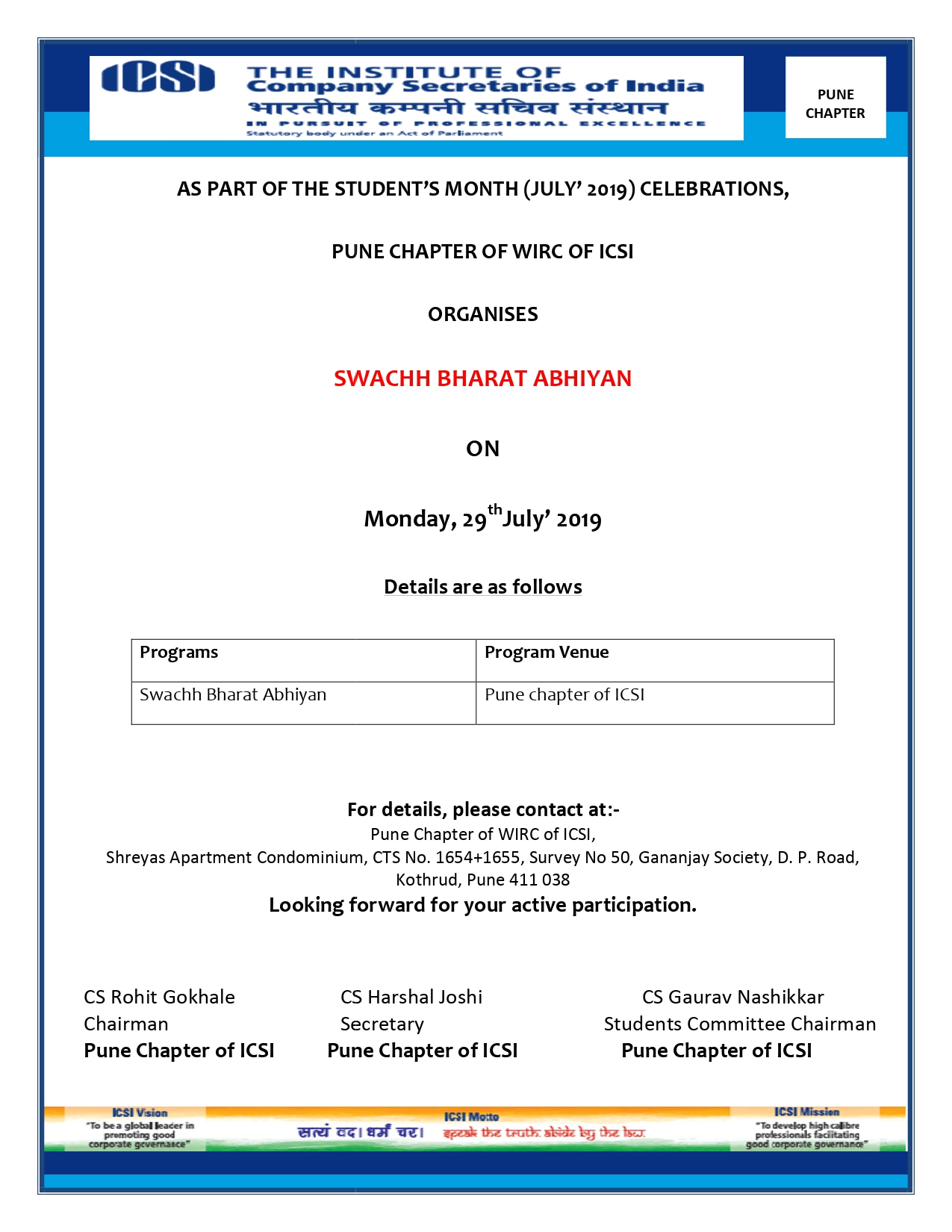 Pune Chapter of WIRC of ICSI, Shreyas Apartment Condominium, CTS No. 1654+1655, Survey No 50, Gananjay Society, D. P. Road, Kothrud, Pune 411 038
