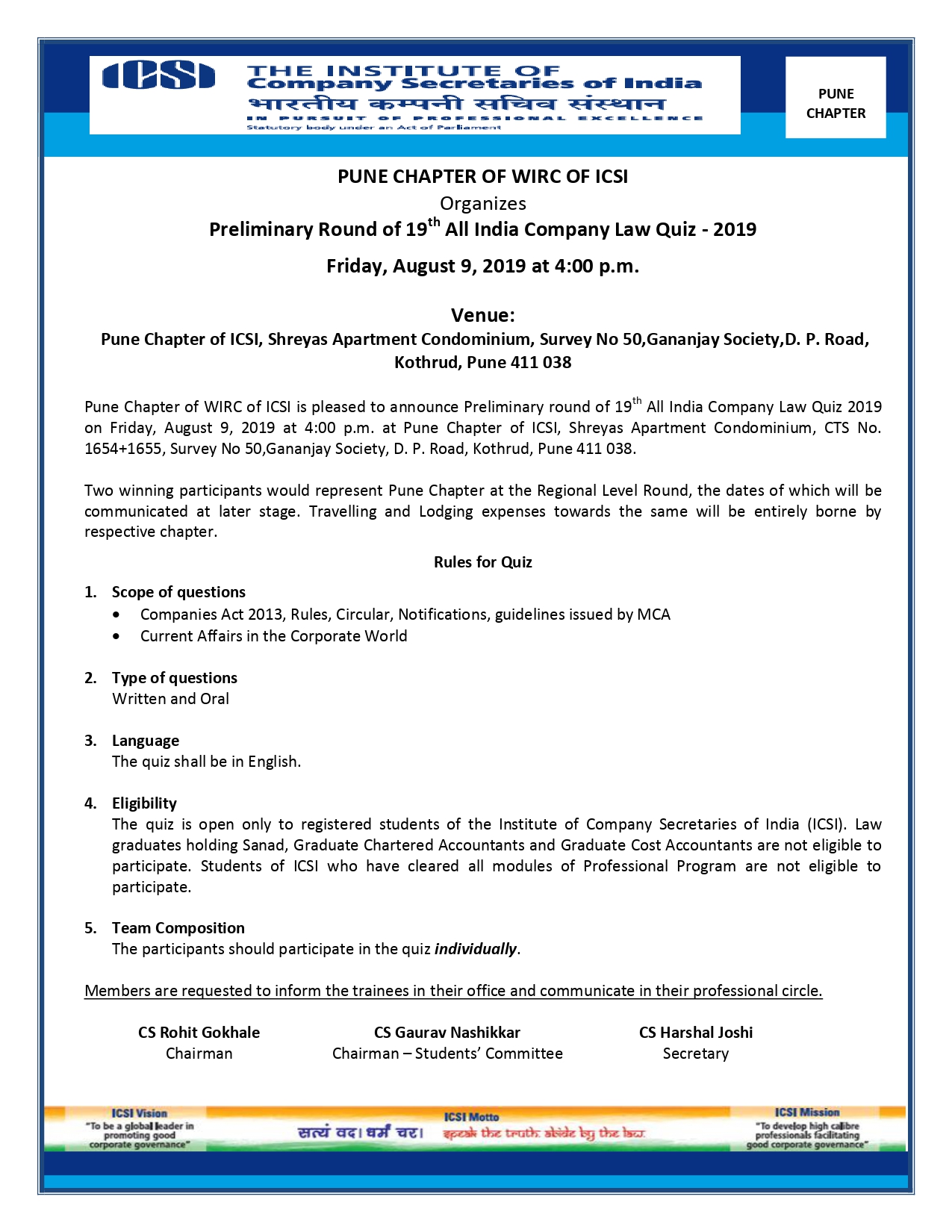 Pune Chapter of ICSI, Shreyas Apartment Condominium, Survey No 50,Gananjay Society,D. P. Road, Kothrud, Pune 411 038