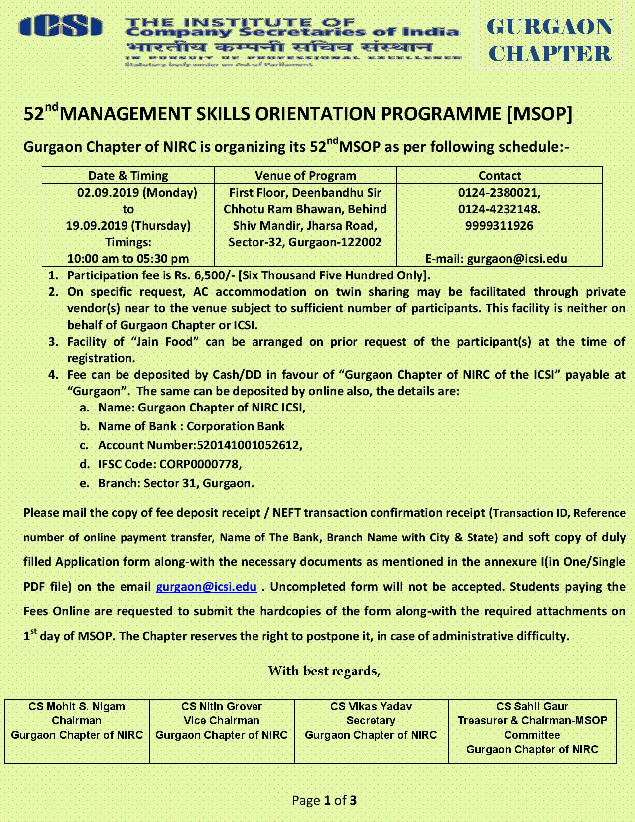52ND MSOP AT GURUGRAM CHAPER FROM 02.09.19 TO 19.09.19