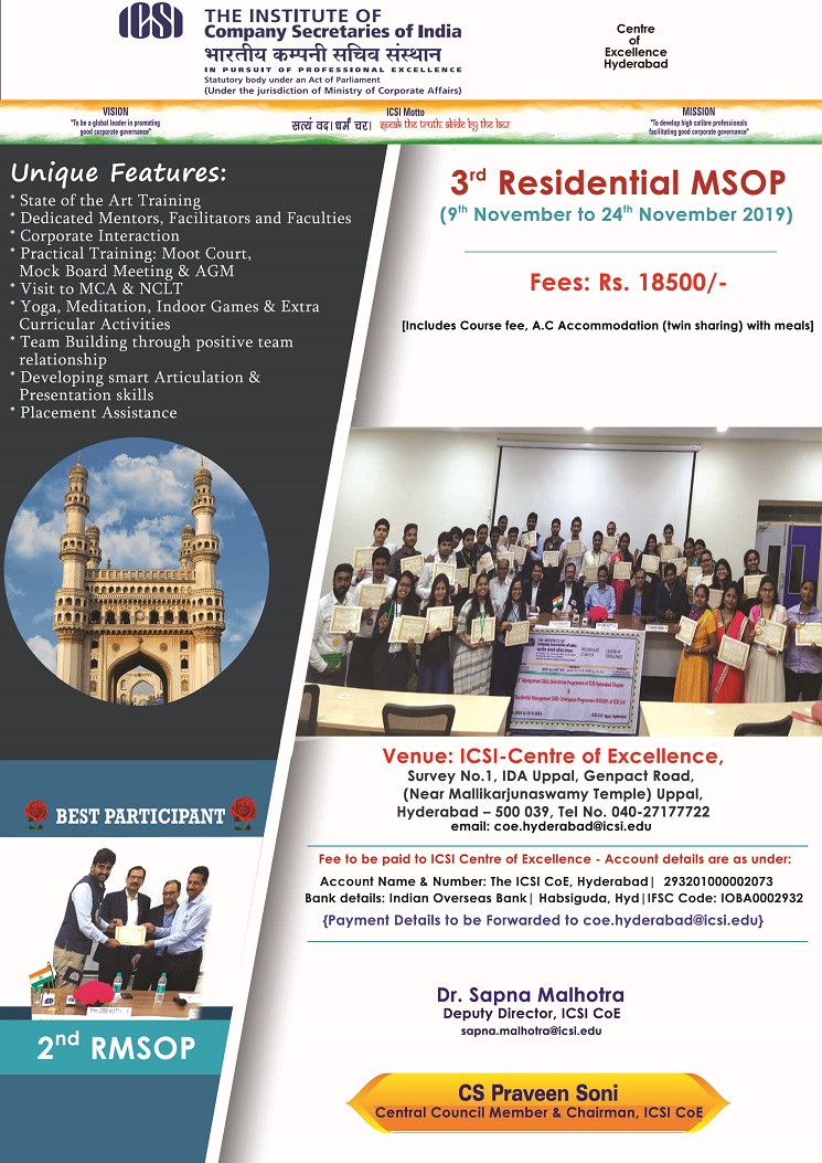 "3rd RMSOP from 9th to 24th November, 2019 at ICSI CoE, Hyderabad