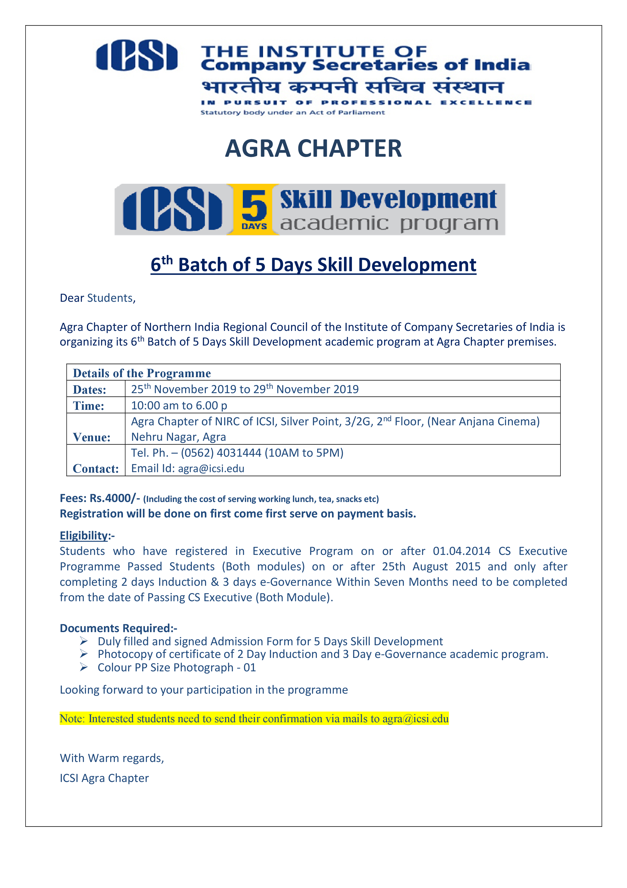 Agra Chapter of NIRC of ICSI, Silver Point, 3/2G, 2nd Floor, (Near Anjana Cinema) Nehru Nagar, Agra