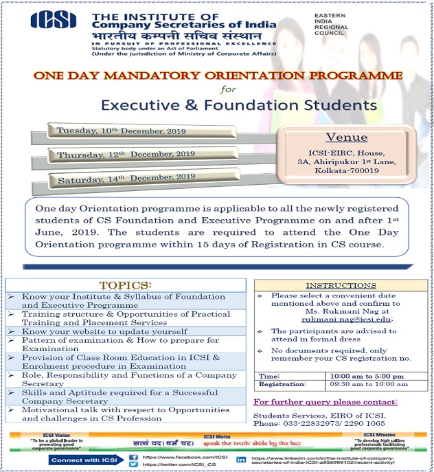 EIRC One Day Mandatory Orientation Programme for Foundation & Executive Students on 10th, 12th and 14th December, 2019 at ICSI-EIRC, Kolkata