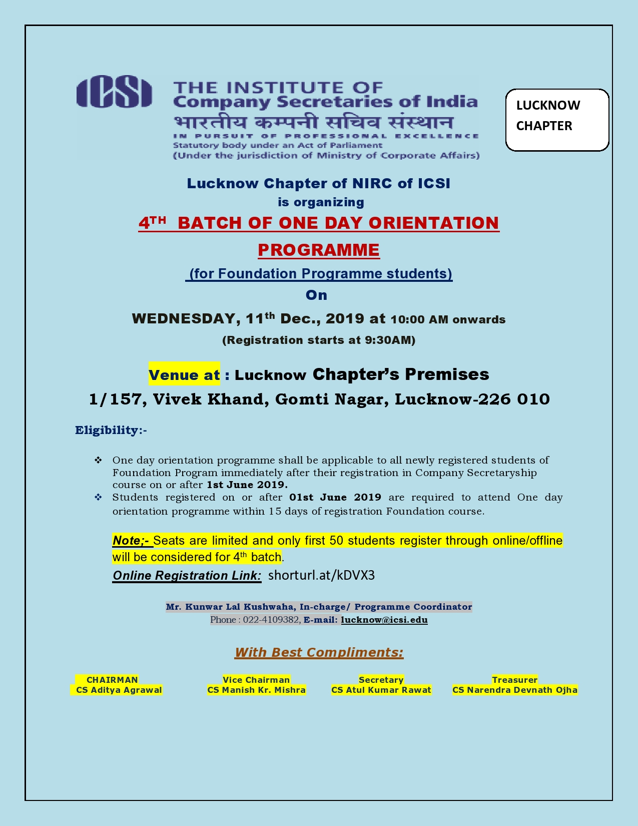 LUCKNOW CHAPTER OF NIRC OF ICSI 1/157, VIVEK-KHAND, GOMTI NAGAR, LUCKNOW-226010