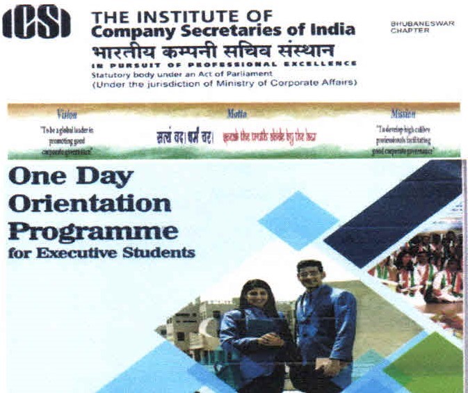 - The 3rd Batch of One Day Mandatory Orientation Programme for Executive Programme of the Bhubaneswar Chapter will be held on Sunday, the 5th January, 2020 at the Bhubaneswar Chapter Office Premises. Eligibility: Students Registered for Executive Programme after 1/6/2019 and have option for undergoing the training at Bhubaneswar. For details, please contact the Chapter at 0674-2552282 / 2551139 or email at bhubaneswar@icsi.edu. This is a free programme for the students have their option for undergoing training at Bhubaneswar. Duration of the programme: 9.30 AM to 5.00 PM. Reporting Time: 9.00 am Dress Code: i. For male participants: Formal dress. ii. For female participants: Formal dress. Students are requested to please attend along with Parents. Lunch & Course Materials & Kits will be provided during the programme