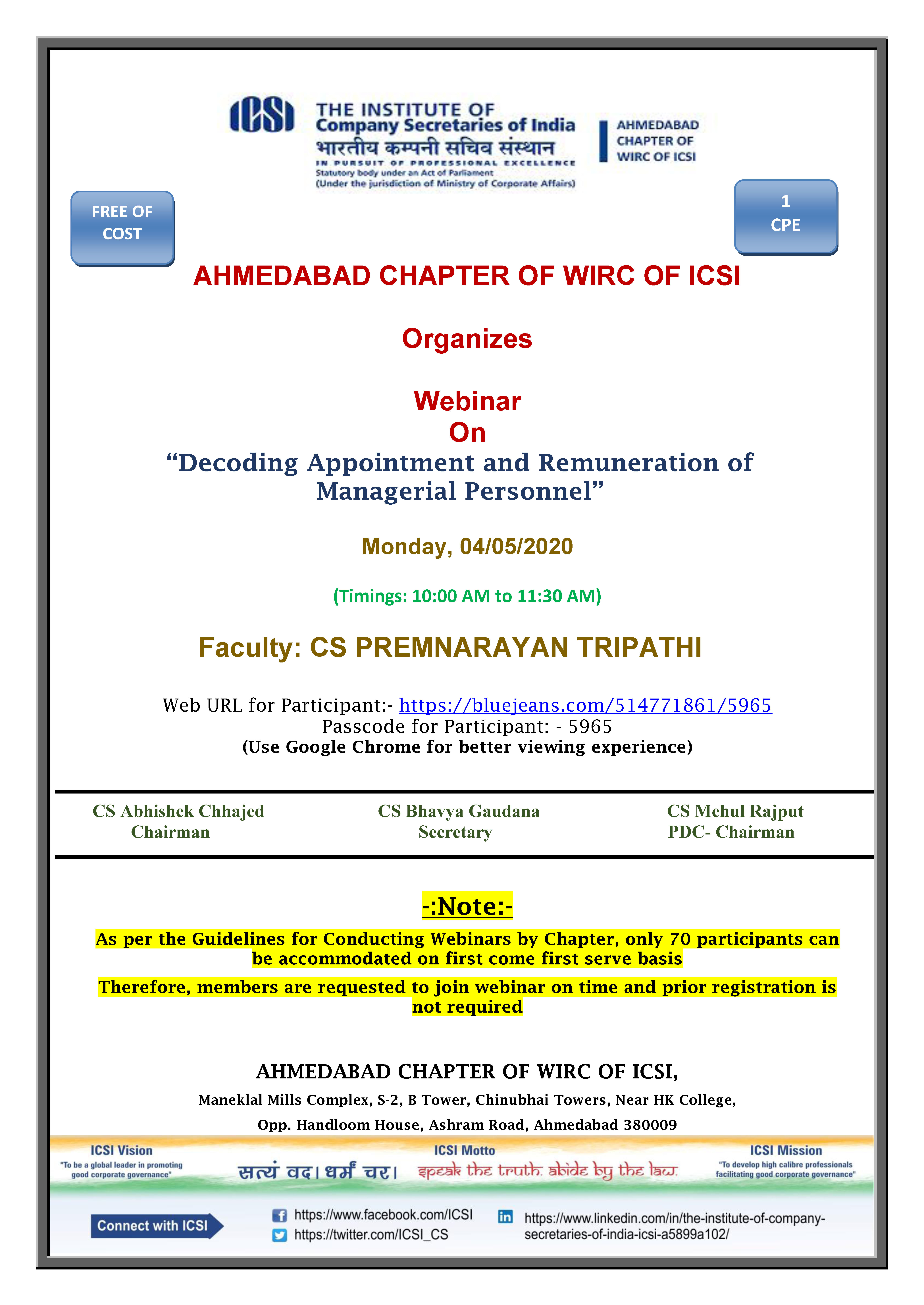 This is to inform you all that Ahmedabad Chapter is Organizing Webinar on “Decoding Appointment and Remuneration of Managerial Personnel”on Monday, 04th May 2020 from 10:00 am to 11:30 am and the Faculty is CS Premnarayan Tripathi