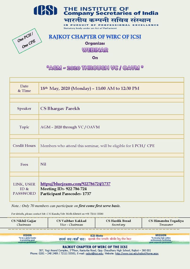 RAJKOT CHAPTER OF WIRC OF ICSI Organizes WEBINAR On “AGM - 2020 THROUGH VC / OAVM ”