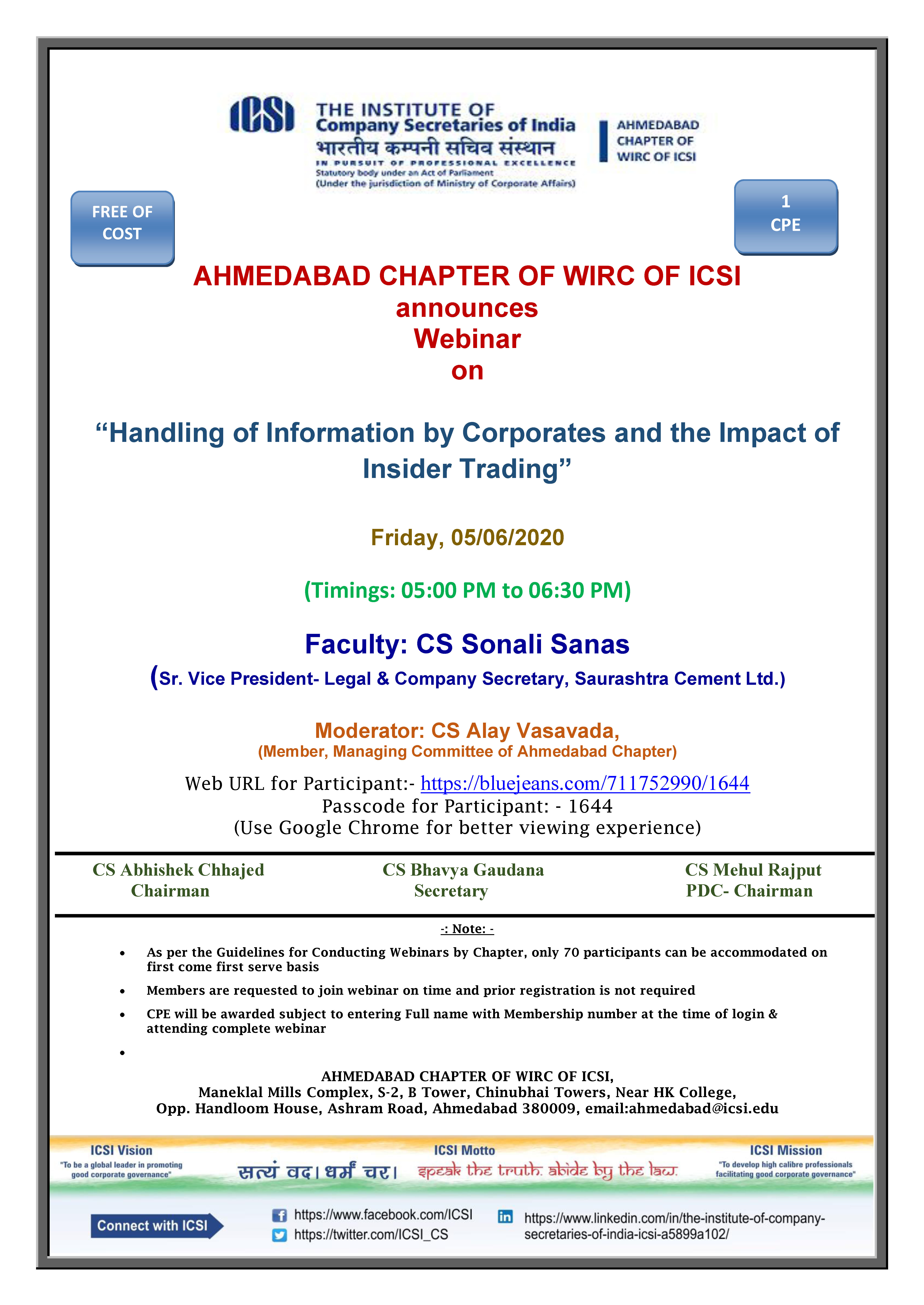 This is to inform you all that Ahmedabad Chapter is Organizing Webinar on “Handling of Information by Corporates and the Impact of Insider Trading” on Friday, June 06, 2020 from 05:00 pm to 06:30 pm and the Faculty is CS Sonali Sanas, Sr. Vice President- Legal & Company Secretary, Saurashtra Cement Ltd.