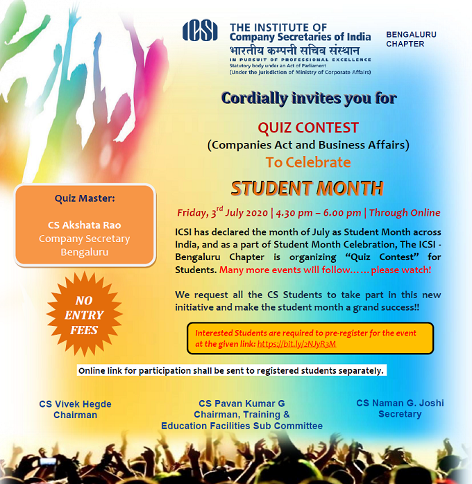 • ICSI - Bengaluru Chapter is conducting Quiz Contest to Celebrate Student Month on 3rd July 2020 from 4.30 pm to 6.00 pm through online. Please click here to register: https://bit.ly/2NJyR3M. Online link for participation shall be sent to registered students separately.