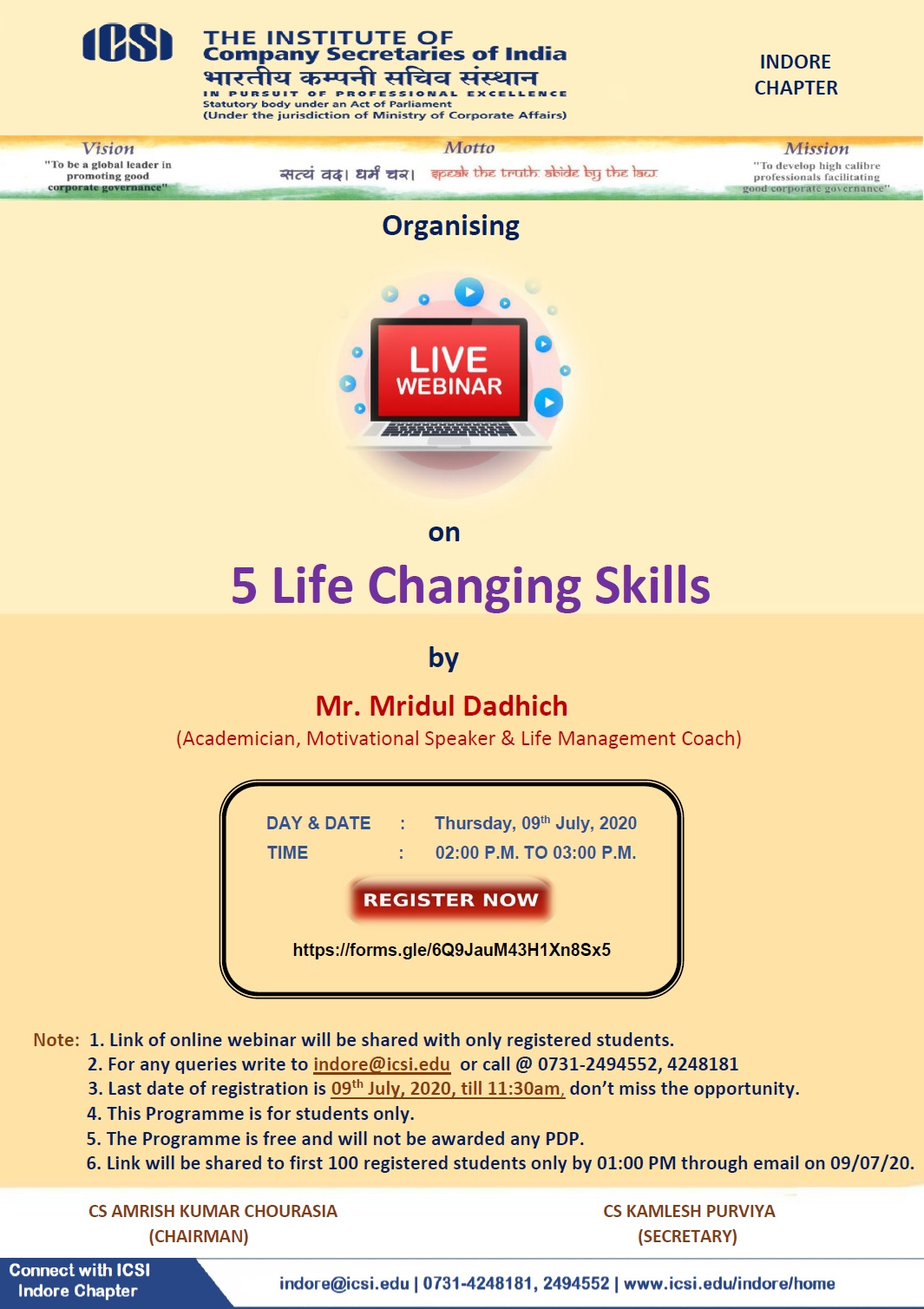 • Indore - Webinar for students on "05 Life Changing Skills"