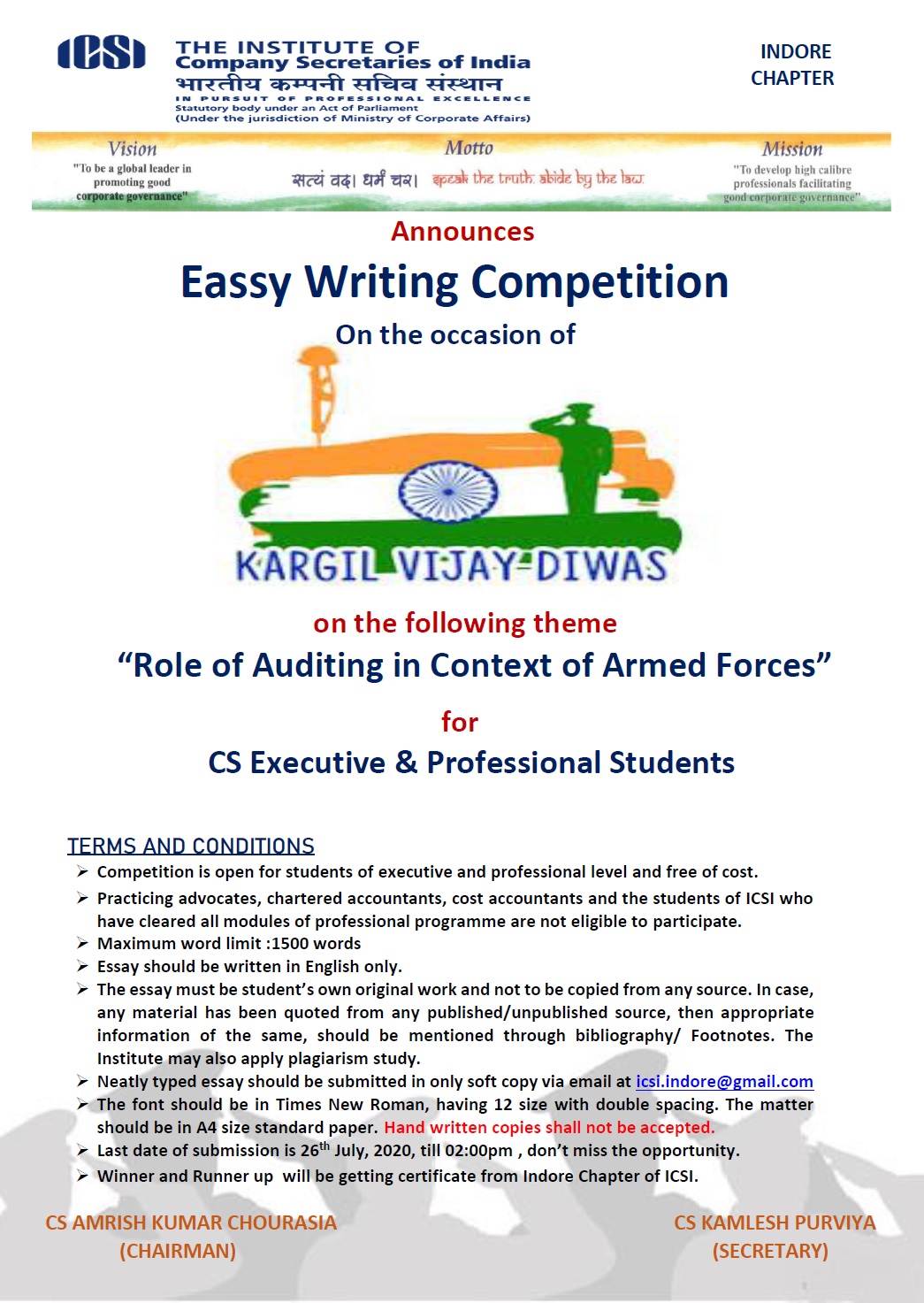 Indore - Essay Writing Competition on "Role of Auditing in context of armed forrces" on the ocassion of KARGIL VICTORY DAY
