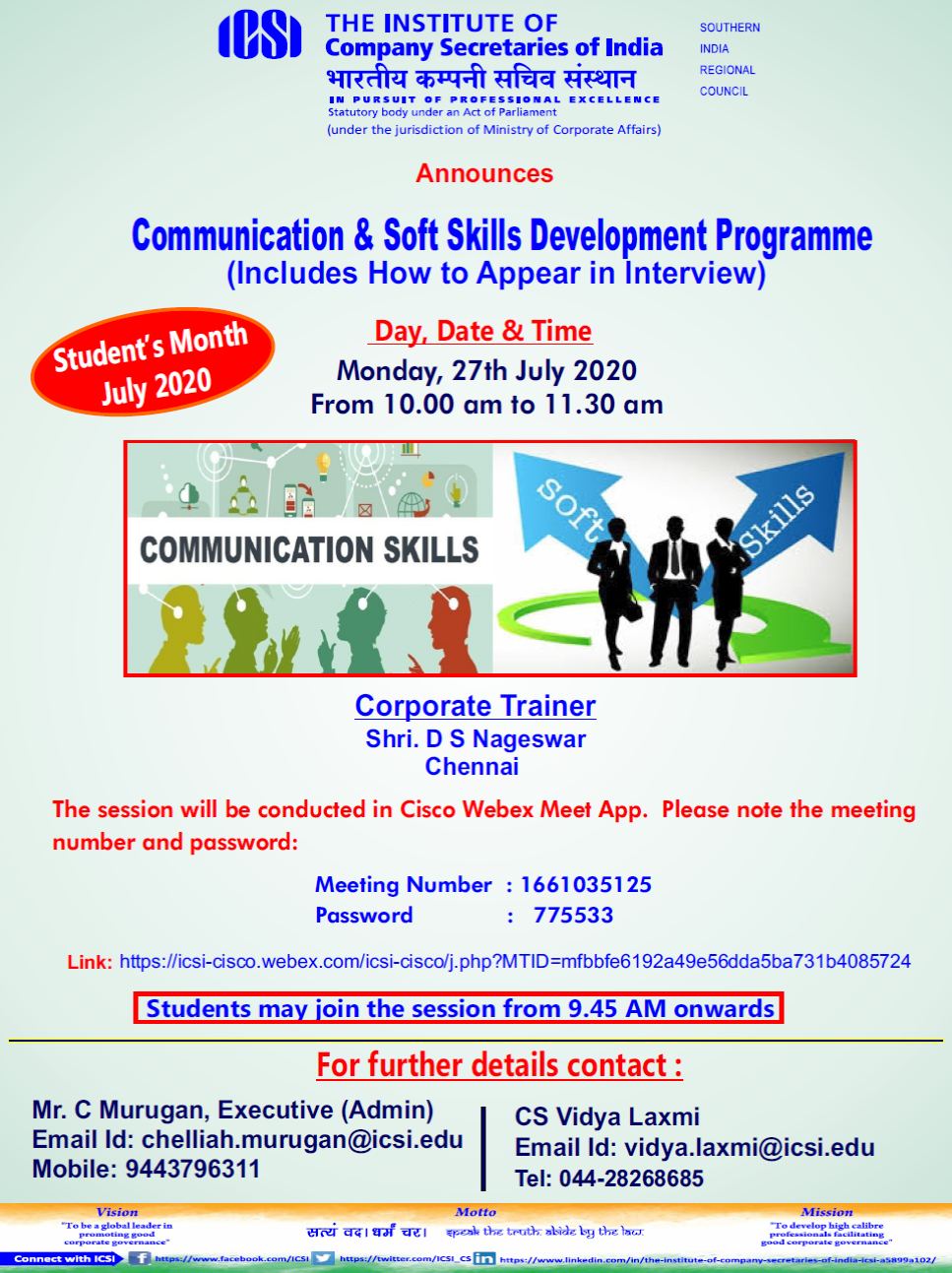 • ICSI-SIRC- Communication & Soft Skills Development & How to Appear in Interview Progamme for Student's Month on 27.07.2020