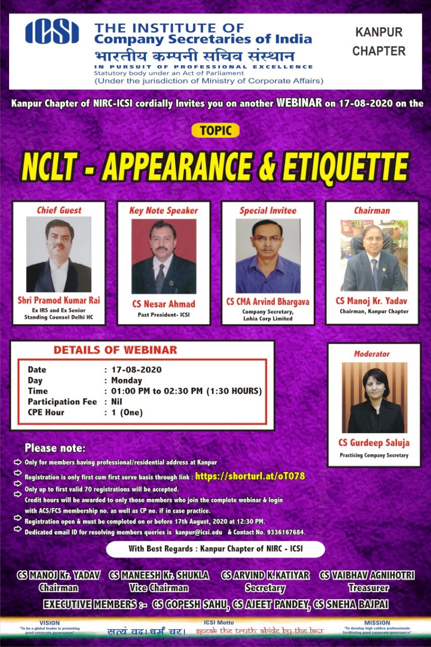 KANPUR CHAPTER WEBINAR ON NCLT- APPEARANCE AND ETIQUETTE