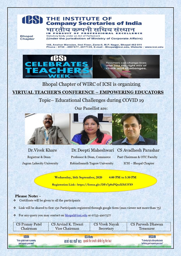 • Bhopal Chapter is organizing VIRTUAL TEACHER’S CONFERENCE – EMPOWERING EDUCATORS