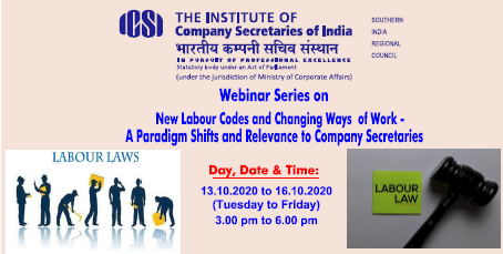 4 Days Webinar on New Labour Codes by ICSI-SIRC from 13.10.2020 to 16.10.2020