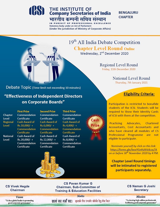 ICSI - Bengaluru Chapter conducting 19th All India Debate Competition_Chapter Level Round
