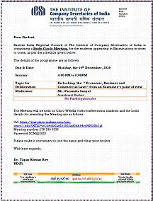 - Eastern India Regional Council of The Institute of Company Secretaries of India is organising a Study Circle Meeting on Re-looking the “ Economic, Business and Commercial Laws” from an Examinee’s point of view on Monday, 14th December, 2020.