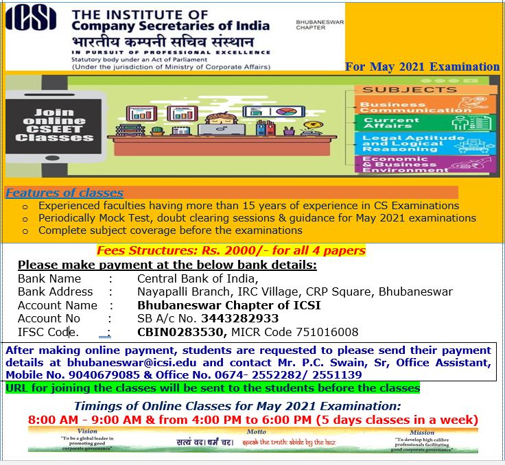 Bhubaneswar Chapter online CSEET classes for May 2021 examination
