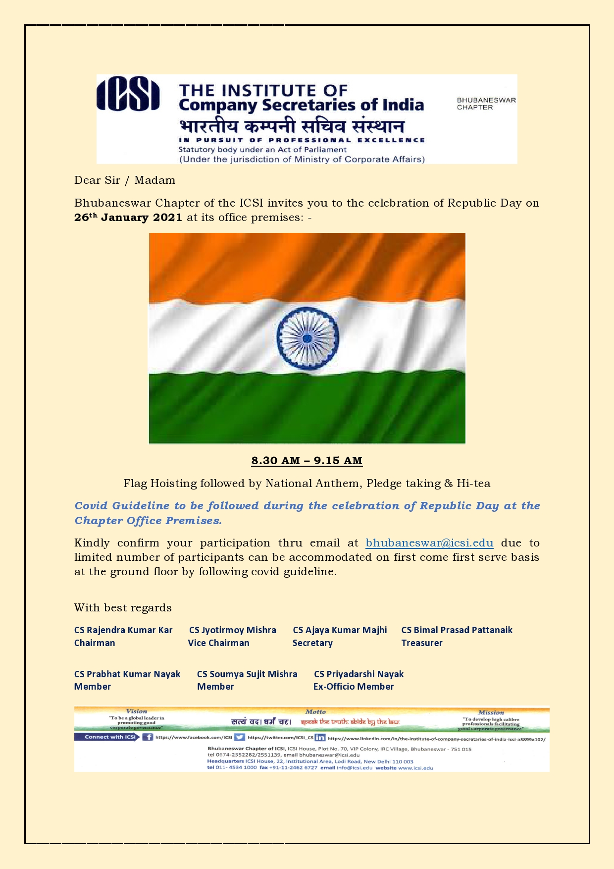 - Bhubaneswar Chapter of the ICSI invites you to the celebration of Republic Day on 26th January 2021 at its office premises: -