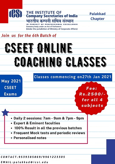 Palakkad Chapter of ICSI, First Floor, Sreekrishna Building, Nurani, Palakkad-678004 Phn:0491-2528558 / 9539385869 Email:palakkad@icsi.edu