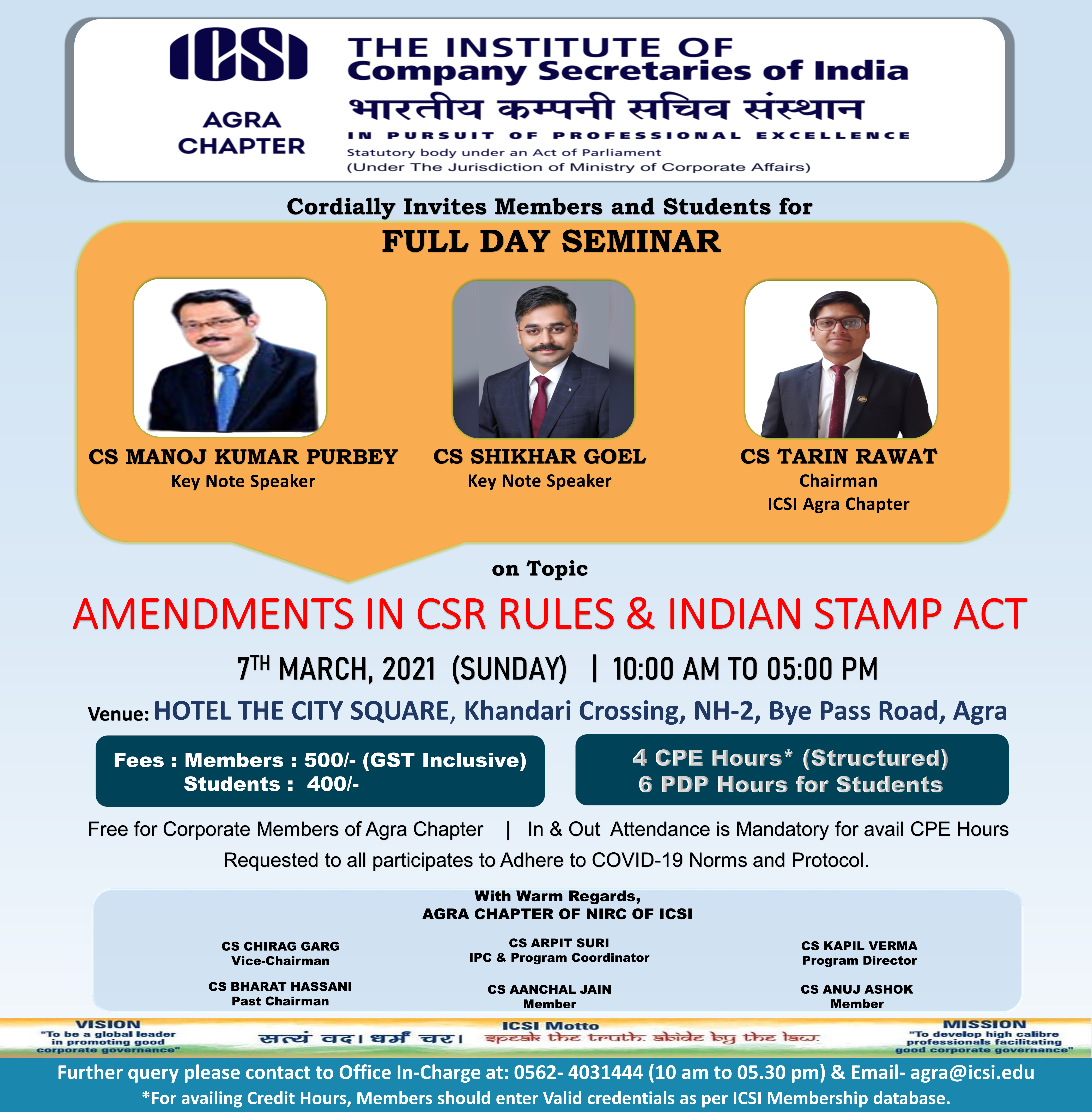 on Topic AMENDMENTS IN CSR RULES & INDIAN STAMP ACT 7TH MARCH, 2021 (SUNDAY) | 10:00 AM TO 05:00 PM Fees : Members : 500/- (GST Inclusive) Students : 400/- 4 CPE Hours* (Structured) 6 PDP Hours for Students