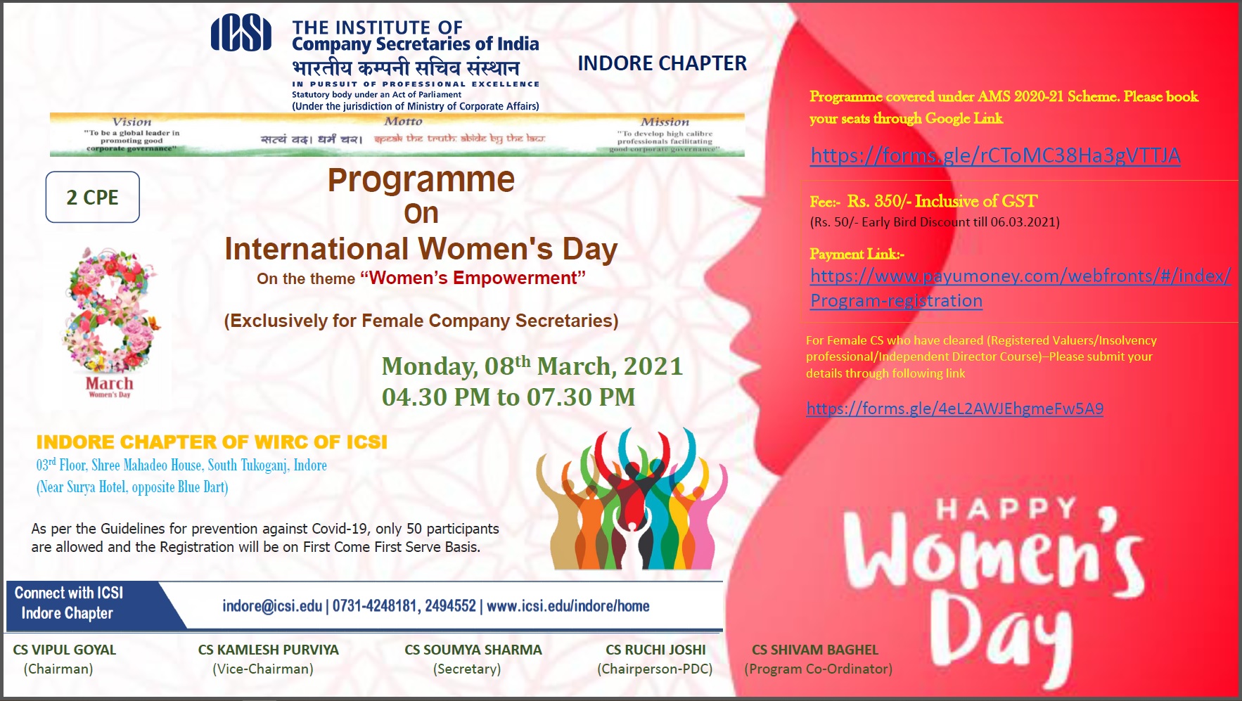 Indore Chapter of WIRC of ICSI is organizing a program on “international Women’s Day” on the theme Women’s Empowerment” at Indore Chapter premises, 03rd Floor, Shree Mahadeo House, South Tukoganj (opposite Blue Dart), Indore on Monday 08th March, 2021 from 04.30 PM to 07.30PM.