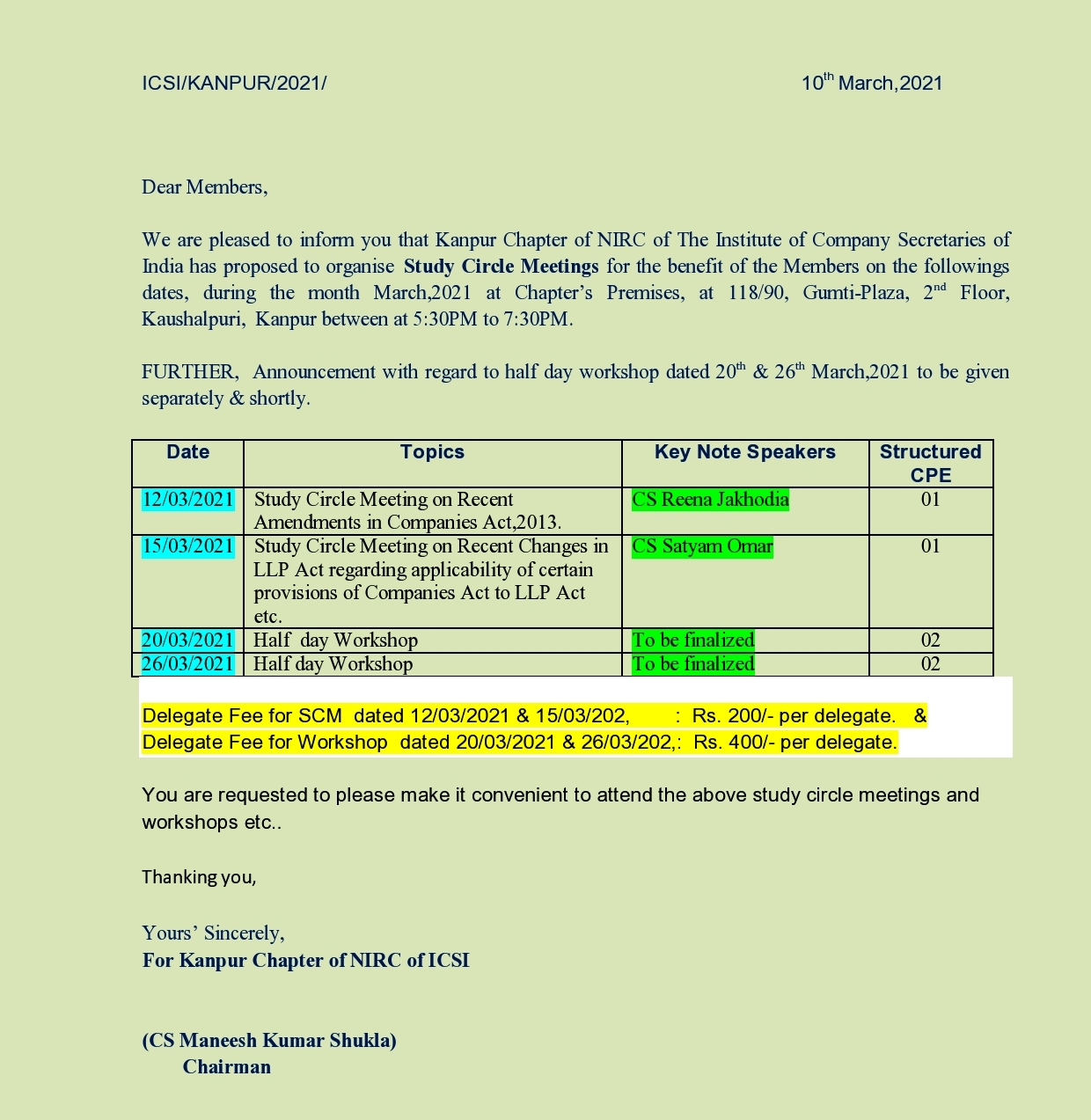Phone : 0512-2296535, 9336167684, E-mail: kanpur@icsi.edu;
