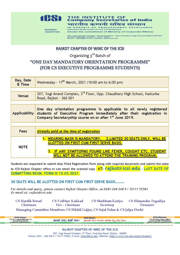 RAJKOT CHAPTER IS ORGANISING ONE DAY ORIENTATION PROGRAM ON 17.03.2021