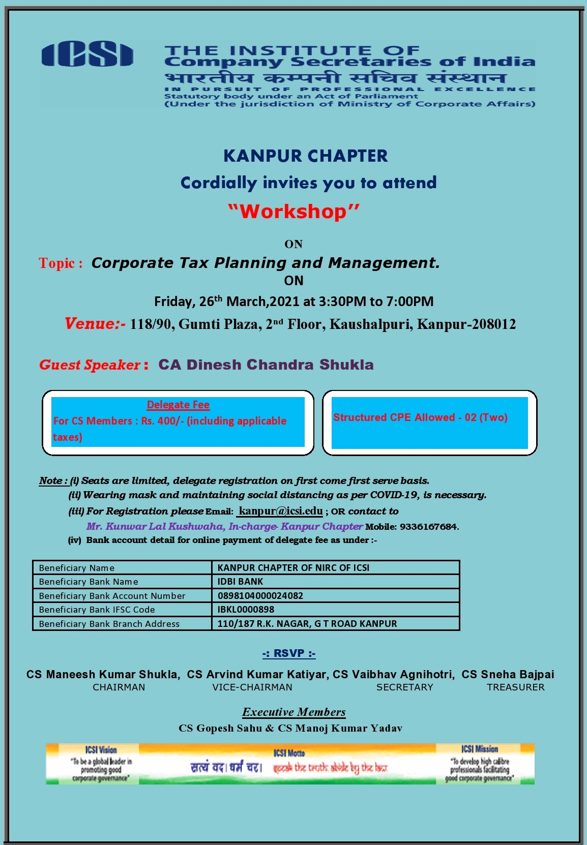 - For details : contact to Mr. Kunwar Lal Kushwaha, Incharge, Kanpur Chapter, Mobile NO. 9336167684
