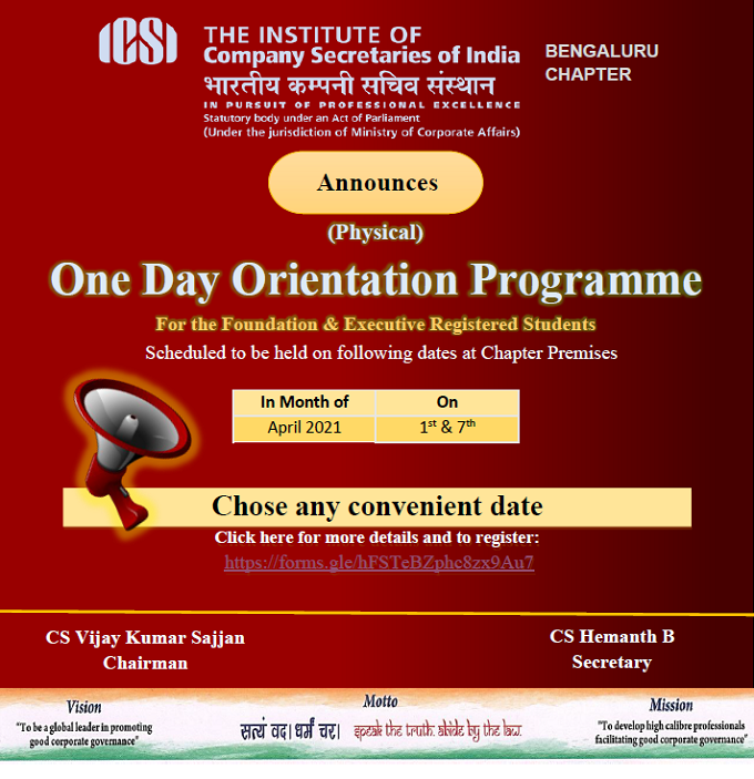 ICSI - Bengaluru Chapter announces One Day Orientation Programme