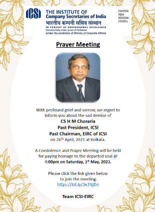 - Prayer Meeting to pay homage to Late Shri H M Choraria, Past President, ICSI on 1st May, 2021 at 4PM