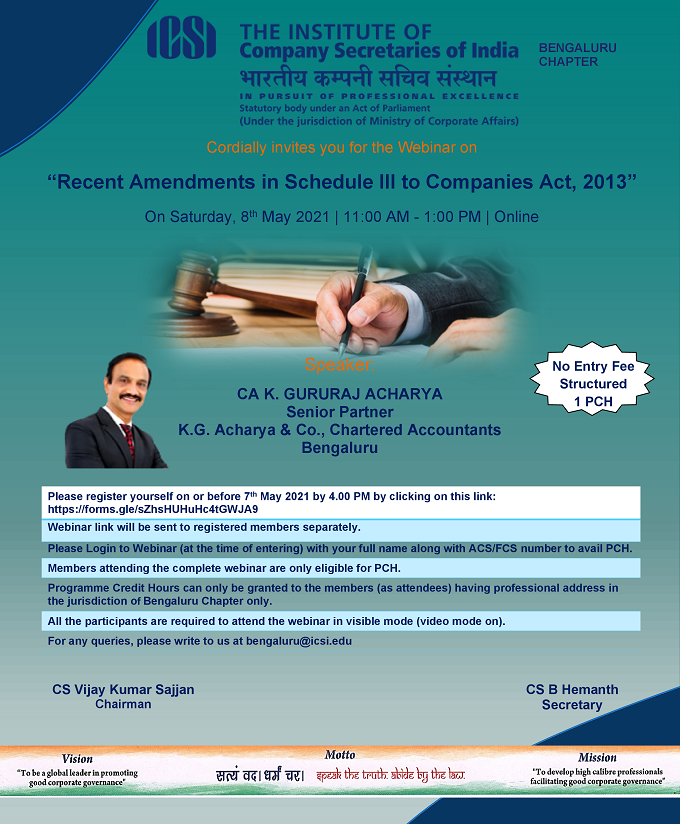 ICSI - Bengaluru Chapter is organising a Webinar on "Recent Amendments in Schedule III to Companies Act, 2013"