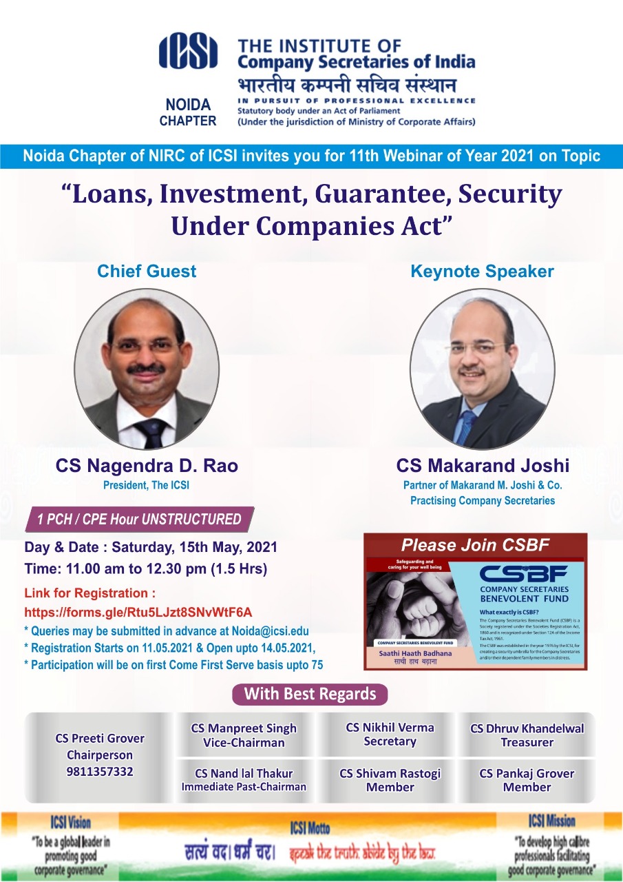 Webinar on Topic “Loans, Investment, Guarantee, Security Under Companies Act”, on Saturday 15th May 2021, from 11:00 am to 12:30 pm.