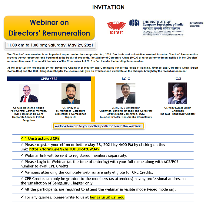 ICSI Bengaluru Chapter organising a webinar jointly with BCIC