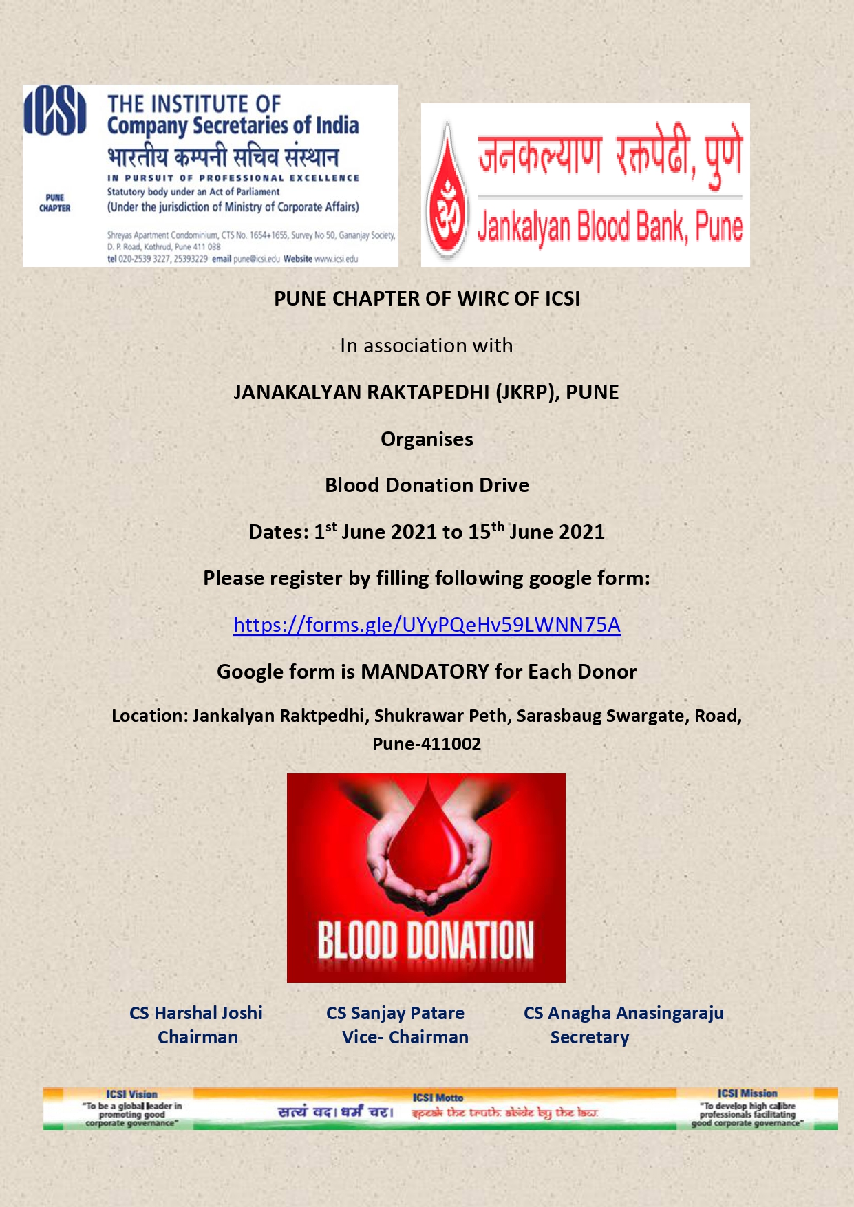 • PUNE CHAPTER OF WIRC OF ICSI In association with JANAKALYAN RAKTAPEDHI (JKRP), PUNE Organizes Blood Donation Drive