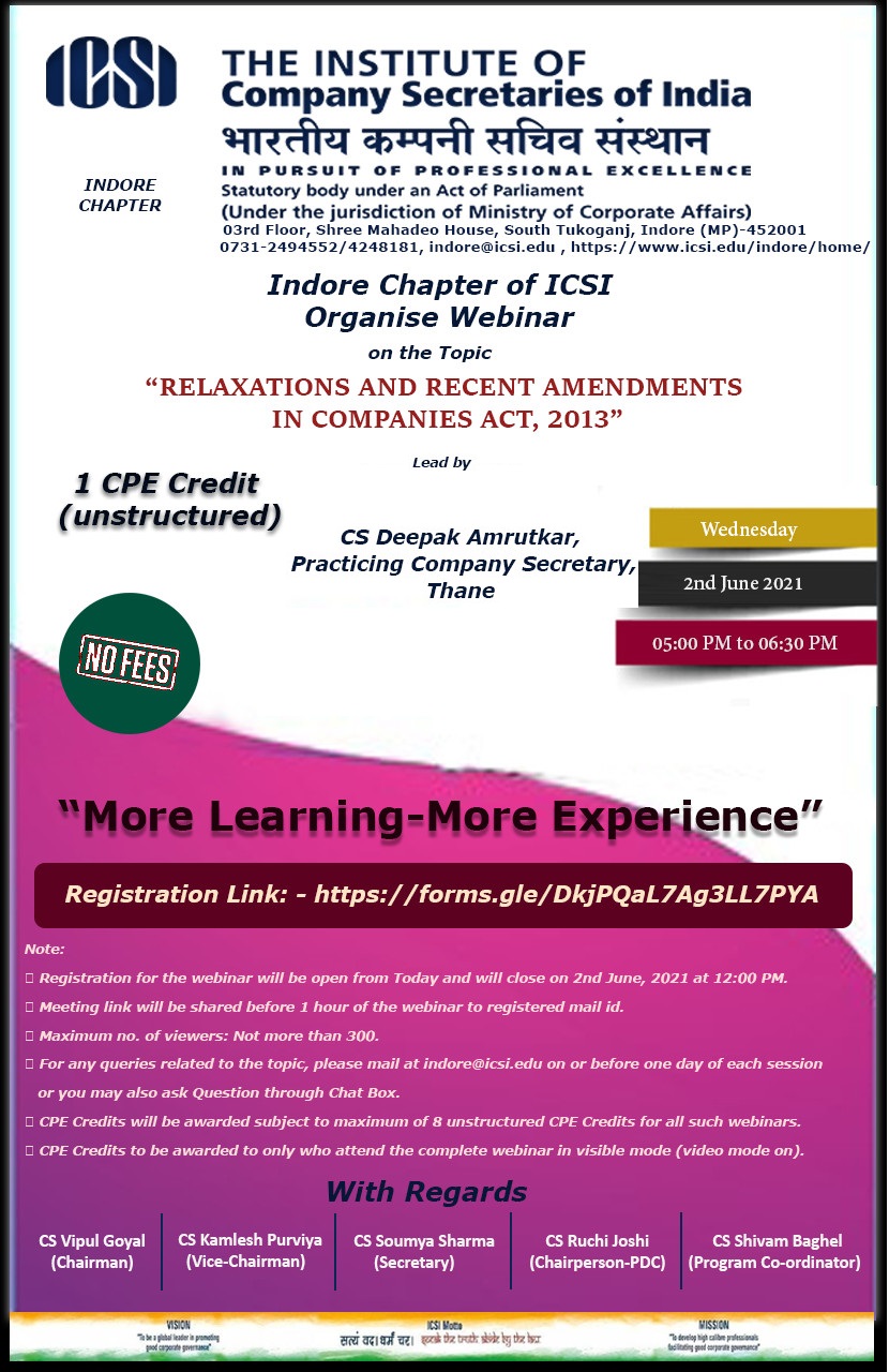 Indore-Webinar on Companies Act, 2013 on 02 June 2021 at 05PM (1 CPE)