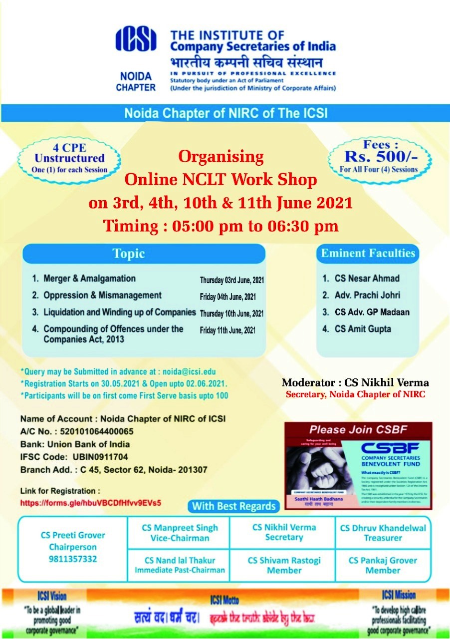 - Online NCLT Workshop by Noida Chapter of NIRC on 3rd, 4th, 10th & 11th June, 2021 from 05:00 pm to 06:30 pm.