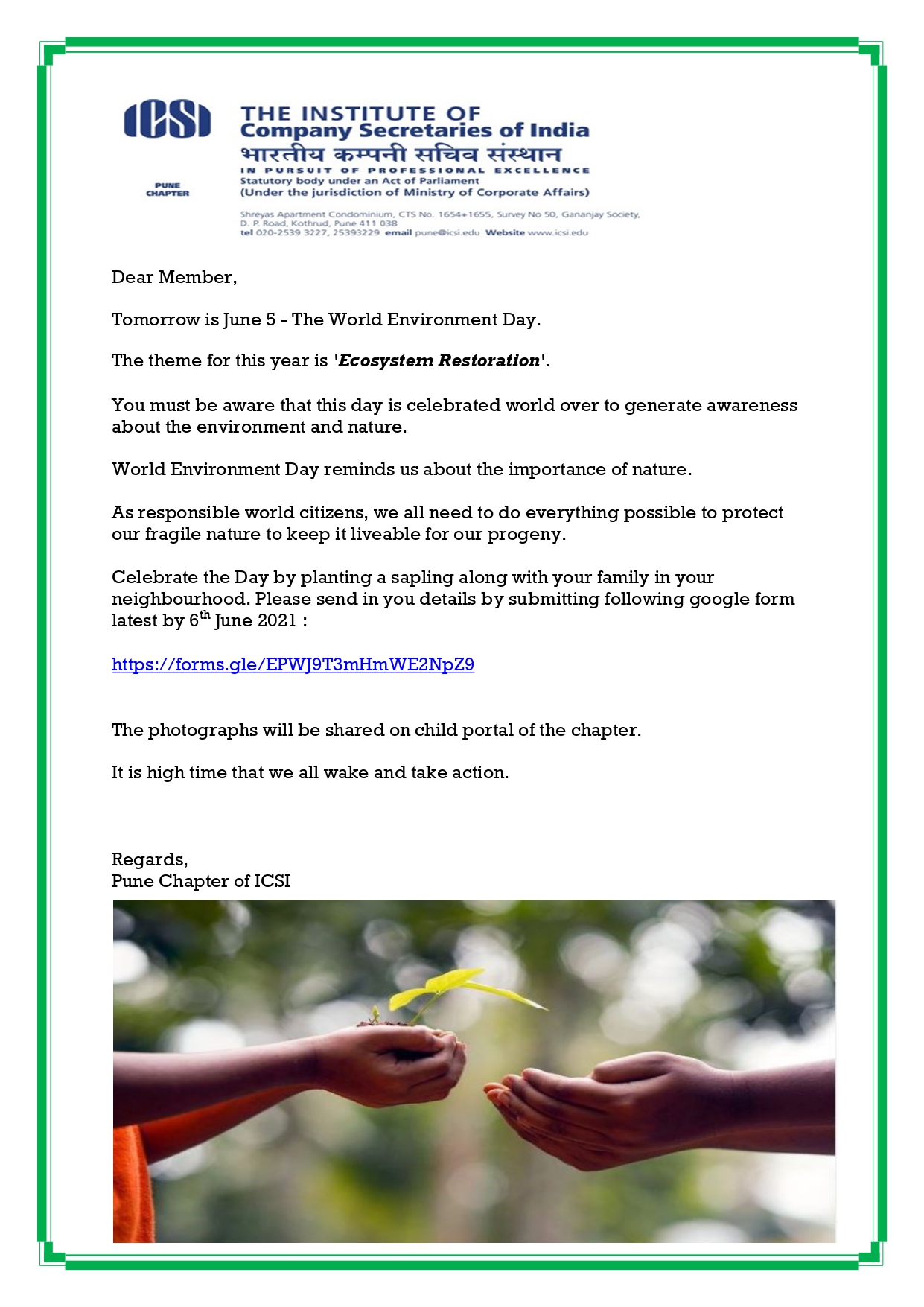 Celebrate the Day by planting a sapling along with your family in your neighborhood. Please send in you details by submitting following Google form latest by 6th June 2021 :